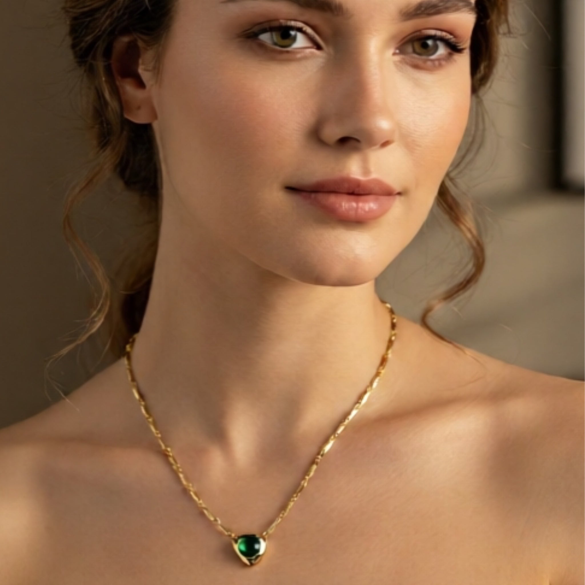 El collar Esencia Esmeralda destaca por su diseño elegante y contemporáneo. Elaborado en tono dorado, presenta una delicada cadena de eslabones finos que sostiene un cristal verde intenso con forma triangular. Su estilo minimalista y sofisticado lo convierte en una pieza ideal para realzar cualquier look con un toque de color y distinción. Perfecto para quienes buscan accesorios versátiles con un acabado refinado y actual.