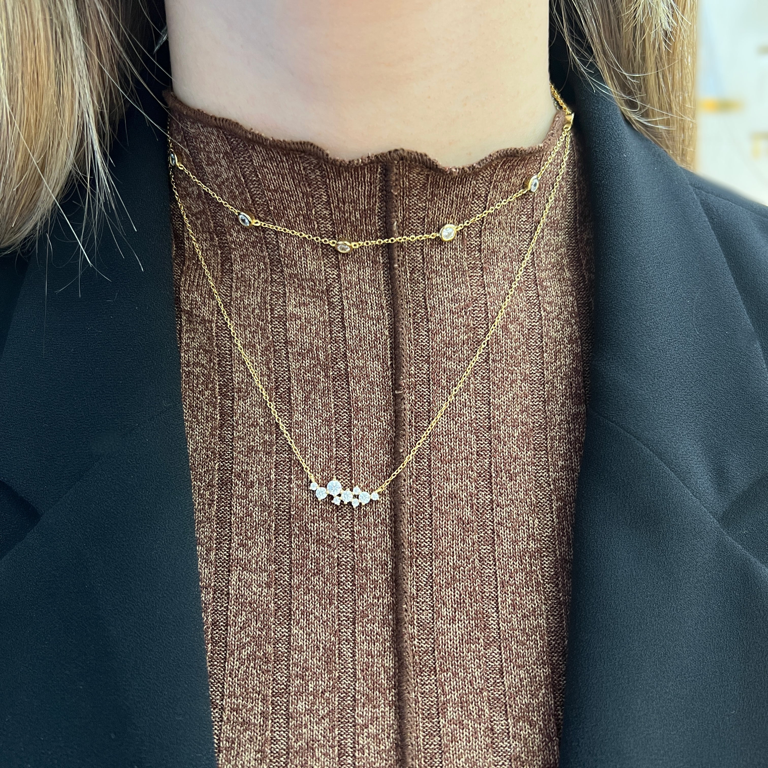 Collar hecho de plata de ley chapada en oro con diseño de flores hechas de circonitas. Muy actual y versátil porque puede combinarse en capas con collares de diferentes largos para obtener un look muy actual.