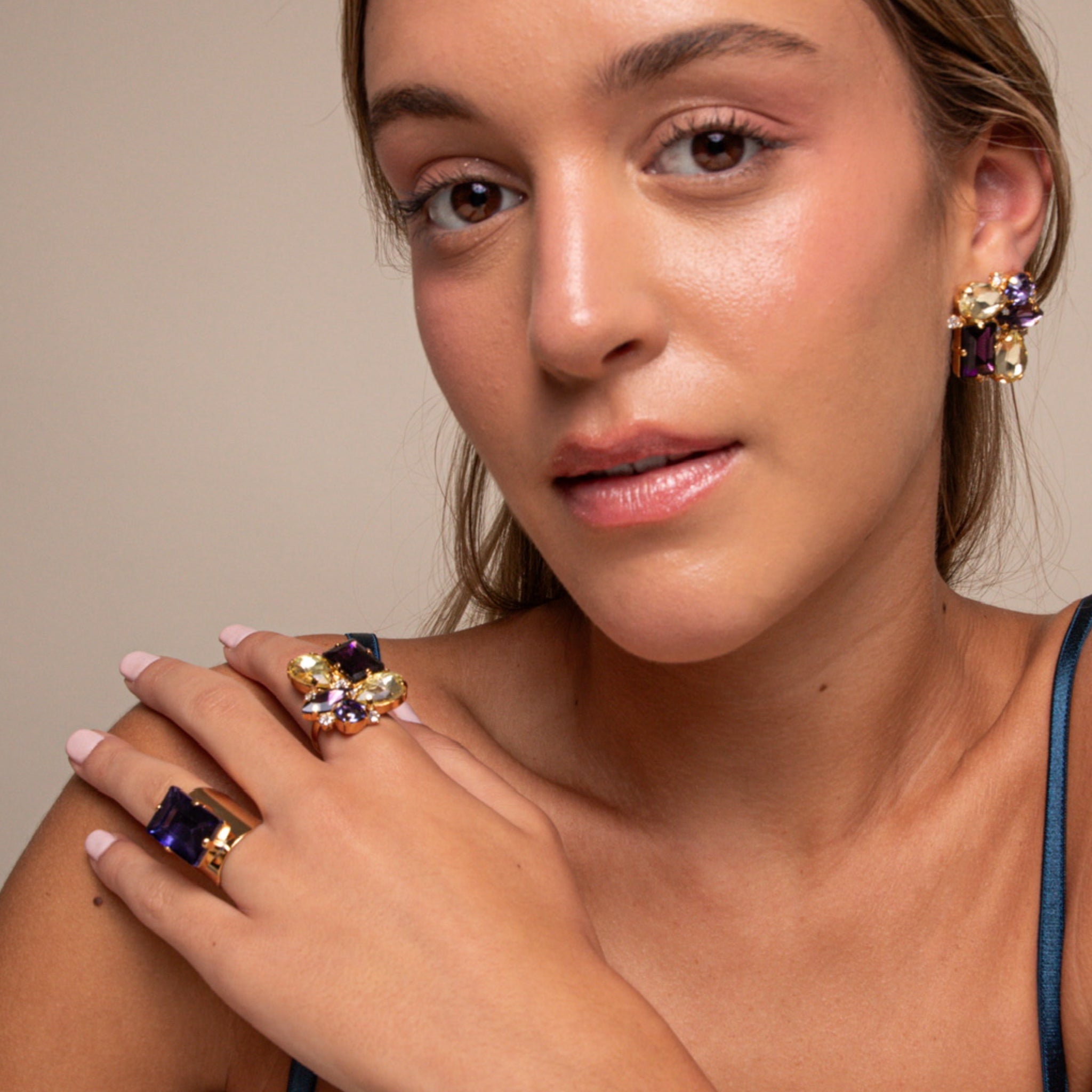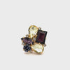 Deslumbra con la sortija Aurora Multicolor, una pieza que combina elegancia y originalidad. Su diseño presenta una composición armoniosa de cristales en tonos burdeos, amatista, azul profundo y champagne, montados sobre una base dorada. Cada piedra, con cortes variados —rectangular, lágrima y marquesa—, capta la luz desde distintos ángulos, creando un efecto sofisticado y glamuroso.