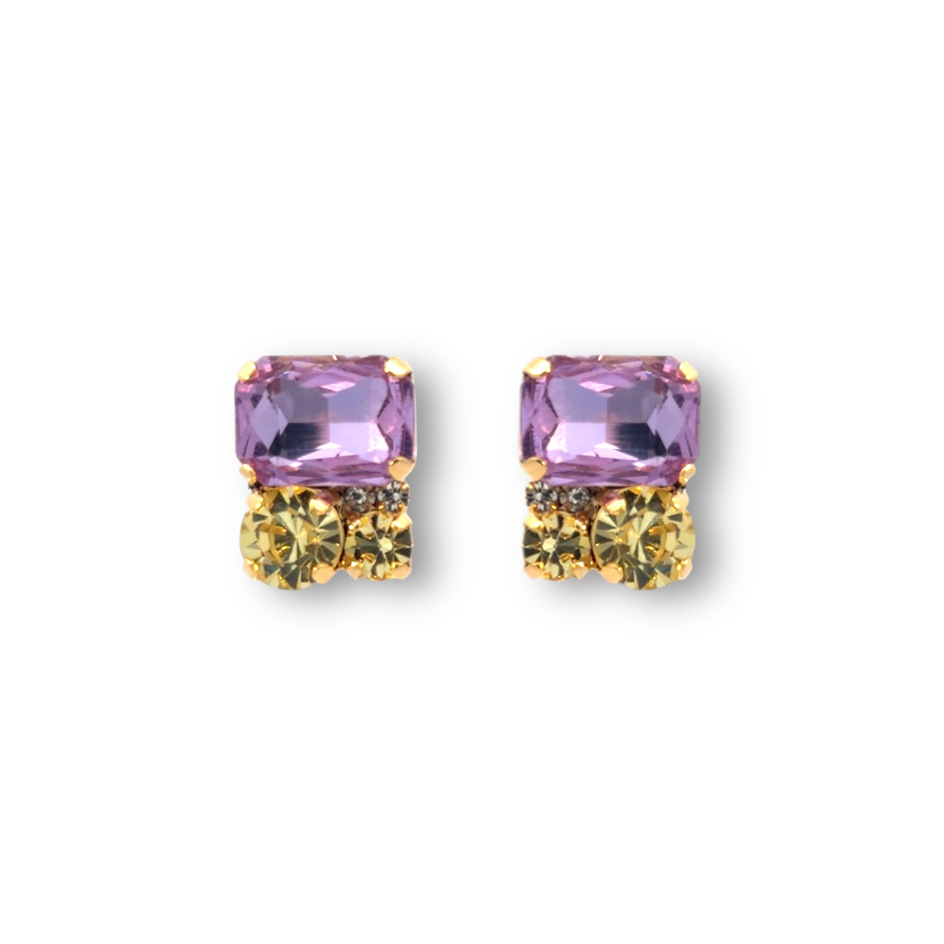 Pendientes con diseño compacto compuesto por un cristal superior en tono lavanda y pequeños cristales en tono topacio que crean un efecto luminoso y sofisticado. La combinación de colores aporta un contraste delicado y elegante, mientras que su tamaño los convierte en una pieza versátil y fácil de llevar. Ideales para invitadas, eventos o para dar un toque sutil de color a cualquier look.