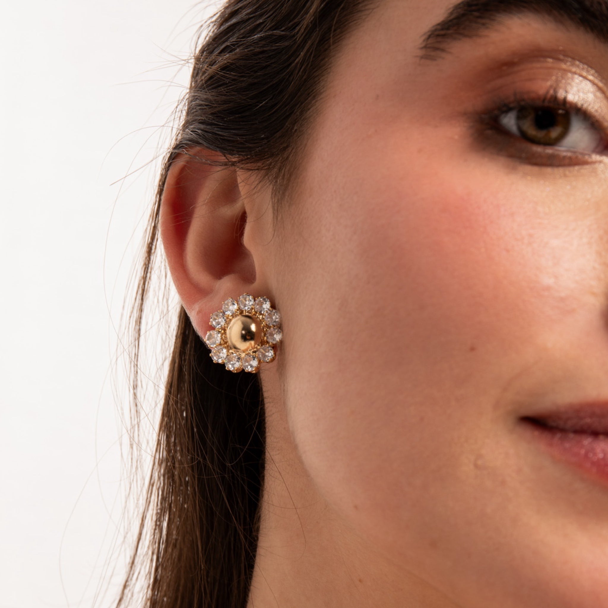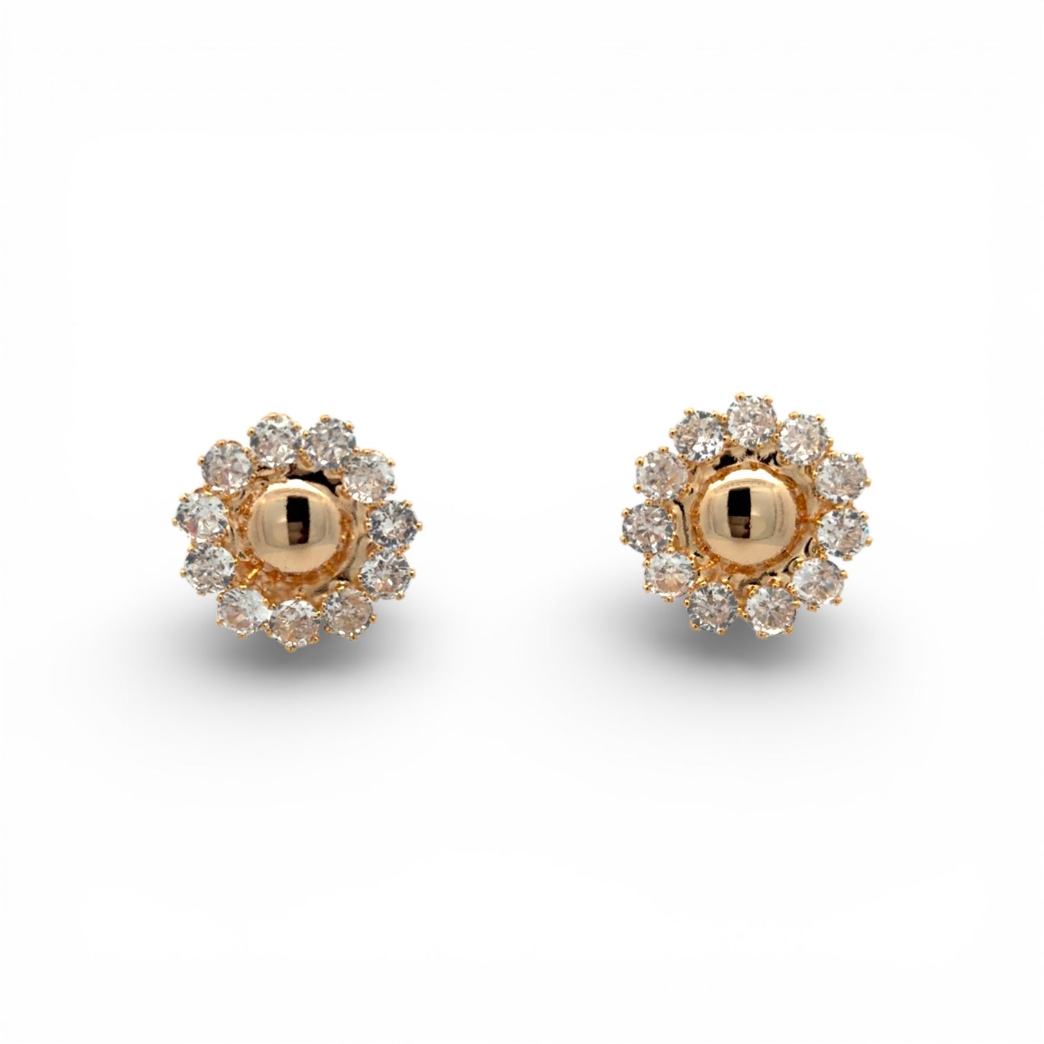 Estos pendientes de botón presentan una esfera central dorada rodeada por un delicado halo de cristales transparentes, creando un efecto luminoso y sofisticado. Su diseño equilibrado combina brillo y sencillez, convirtiéndolos en una pieza atemporal que eleva cualquier look, desde el más cotidiano hasta uno más especial.