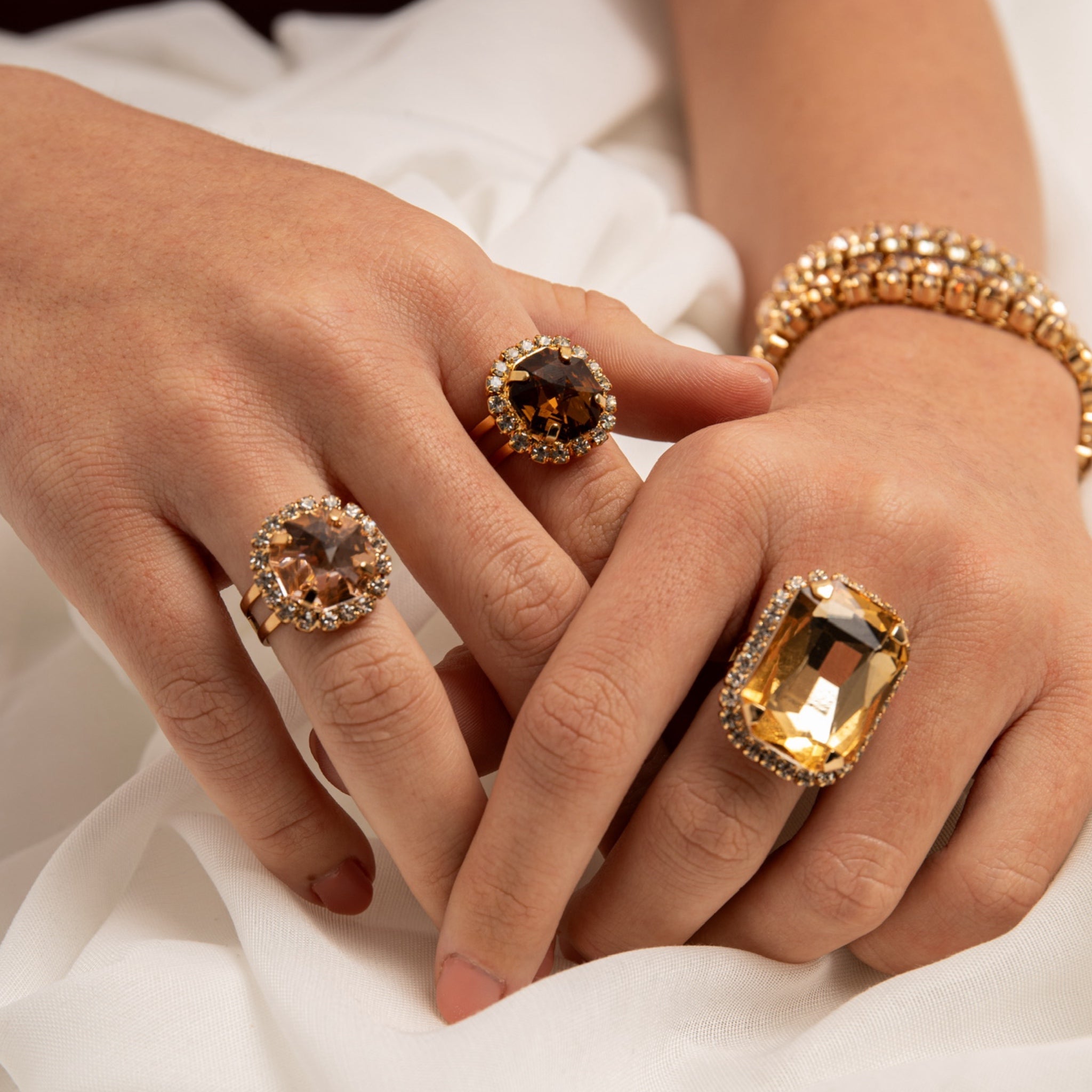Luce elegante y sofisticada con este anillo dorado, protagonista de cualquier look. Su cristal central en tono champaña de corte redondo está rodeado por un halo de finos brillantes que le aportan un destello único. Perfecto para elevar tu outfit en eventos especiales o darle un toque glamoroso a tu día a día.