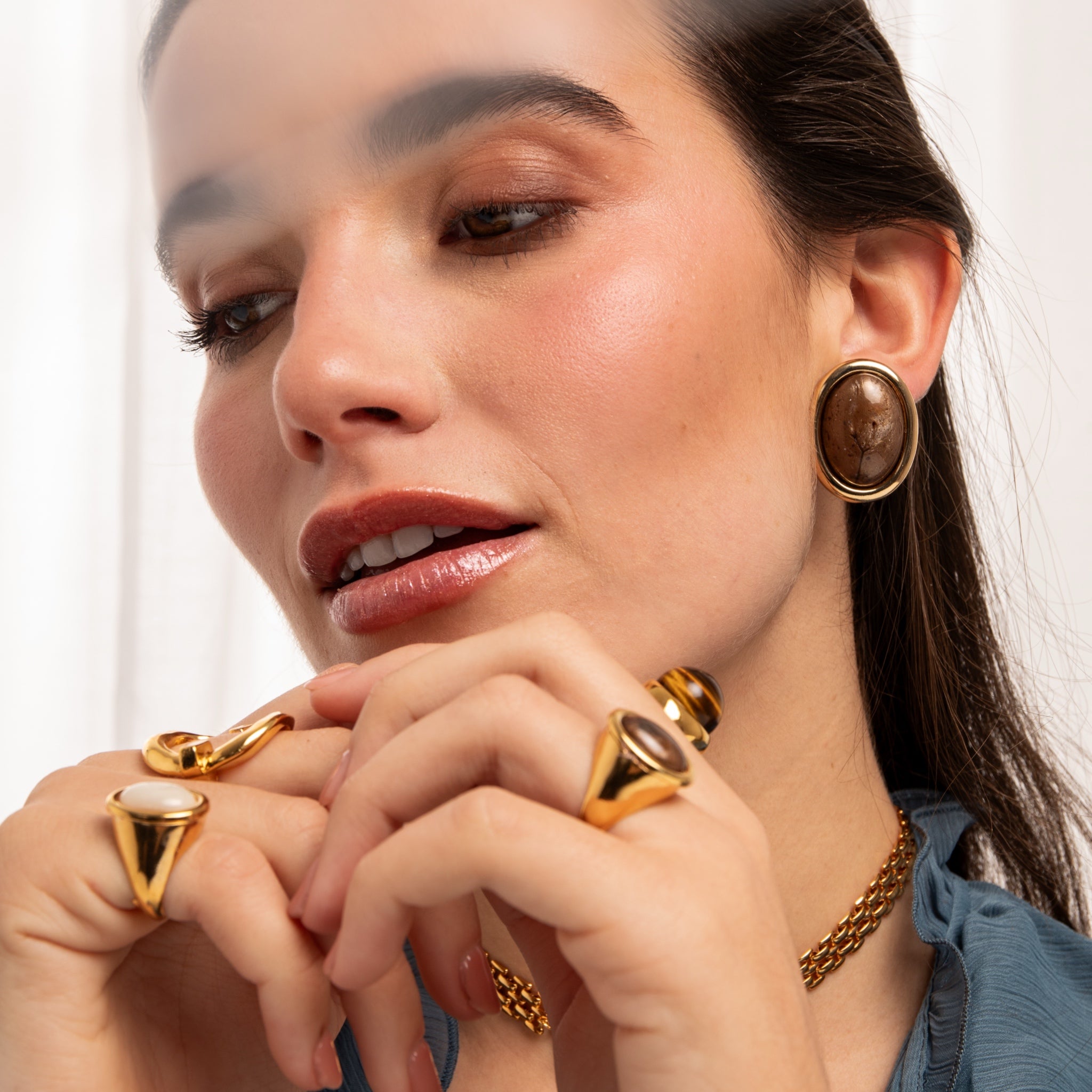 Pendientes con forma ovalada, acabado dorado y piedra sintética en color negro. Su diseño sobrio y elegante los convierte en un básico versátil para cualquier ocasión. El negro es un color asociado con la protección, el misterio y la fuerza interior, lo que aporta a estos pendientes un aire sofisticado y atemporal. Ligeros y fáciles de combinar, son perfectos para el uso diario o para completar un look más formal con un toque de discreta distinción.