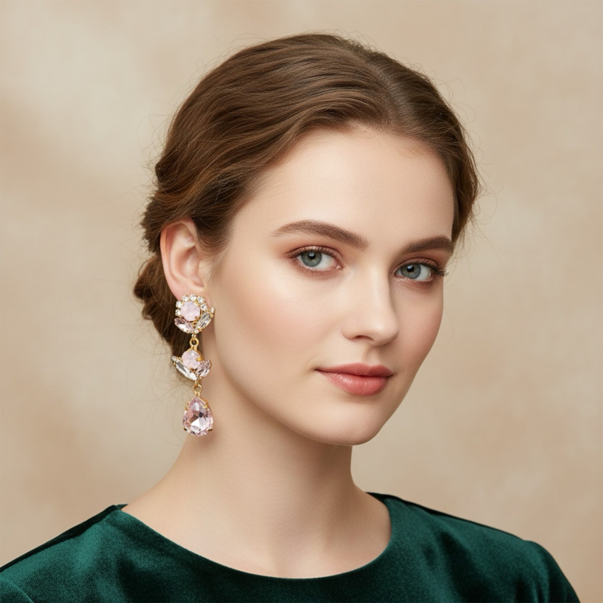Deslumbra con estos pendientes colgantes de cristales Swarovski en tono rosa palo, una joya que combina elegancia y feminidad en cada detalle. Su diseño dorado realza la luminosidad de los cristales tallados en diferentes formas, redonda, marquesa y lágrima, creando un juego de luz sofisticado y delicado. Ideales para ocasiones especiales o para elevar un look cotidiano con un toque romántico y refinado.
