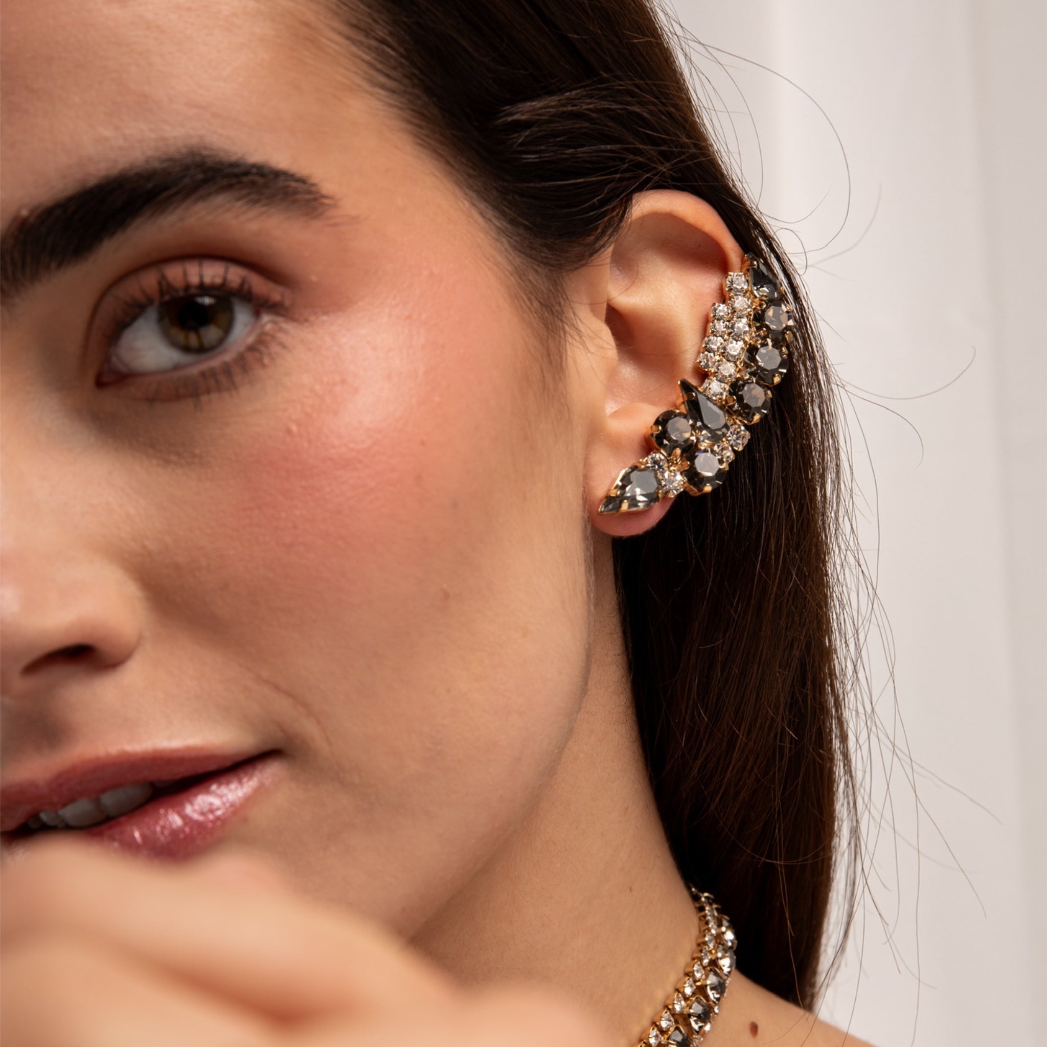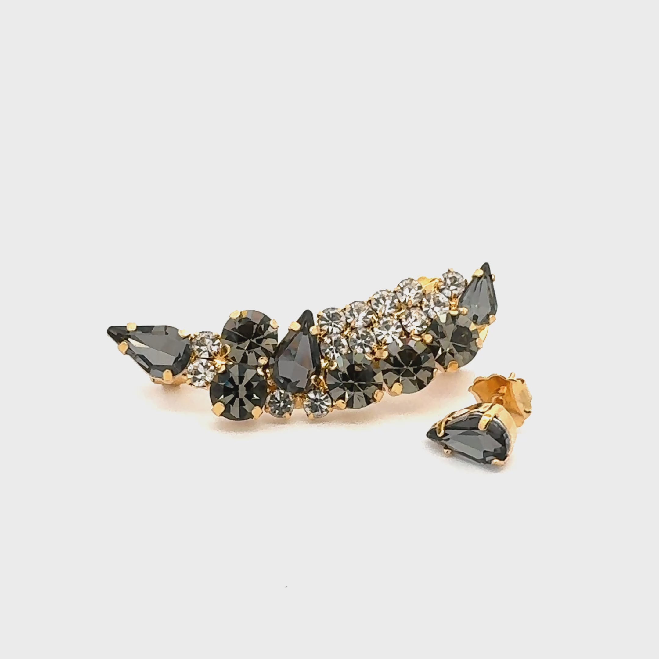 Estos pendientes trepadores asimétricos decorados con cristales de color diamante negro ofrecen una joya única y sofisticada. Su diseño moderno y original aporta un aire contemporáneo, mientras que las piedras brindan un resplandor delicado y elegante. Perfectos para quienes desean destacar con estilo en eventos especiales, estos pendientes realzan cualquier atuendo con un toque de distinción y elegancia.