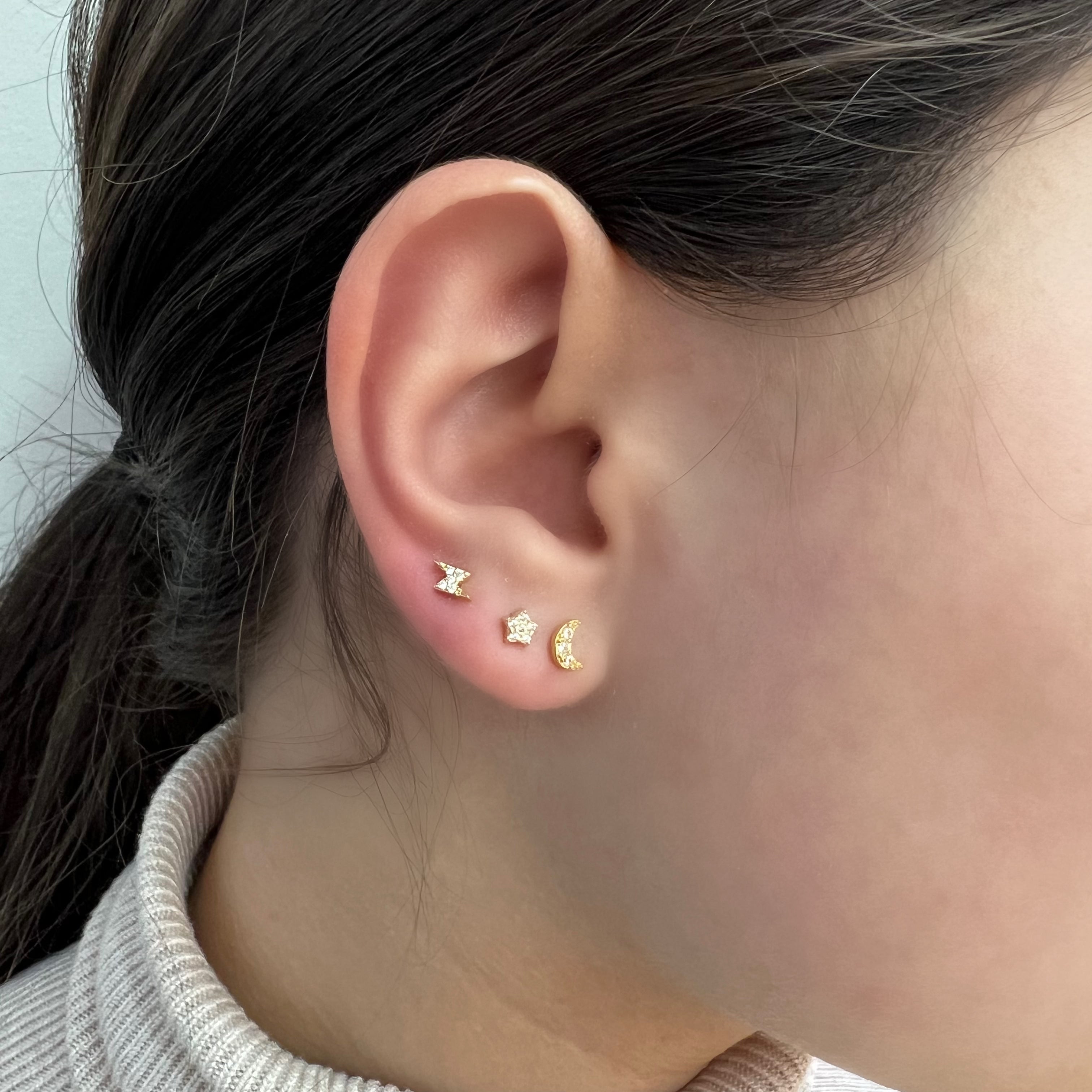 Pendiente pequeño en plata de ley con diseño de rayo chapado en oro, decorado con circonitas blancas. Se vende por unidad para combinarlo con ear cuffs y otros mini pendientes. Es ideal si se mezcla con joyería de la misma temática de colores.