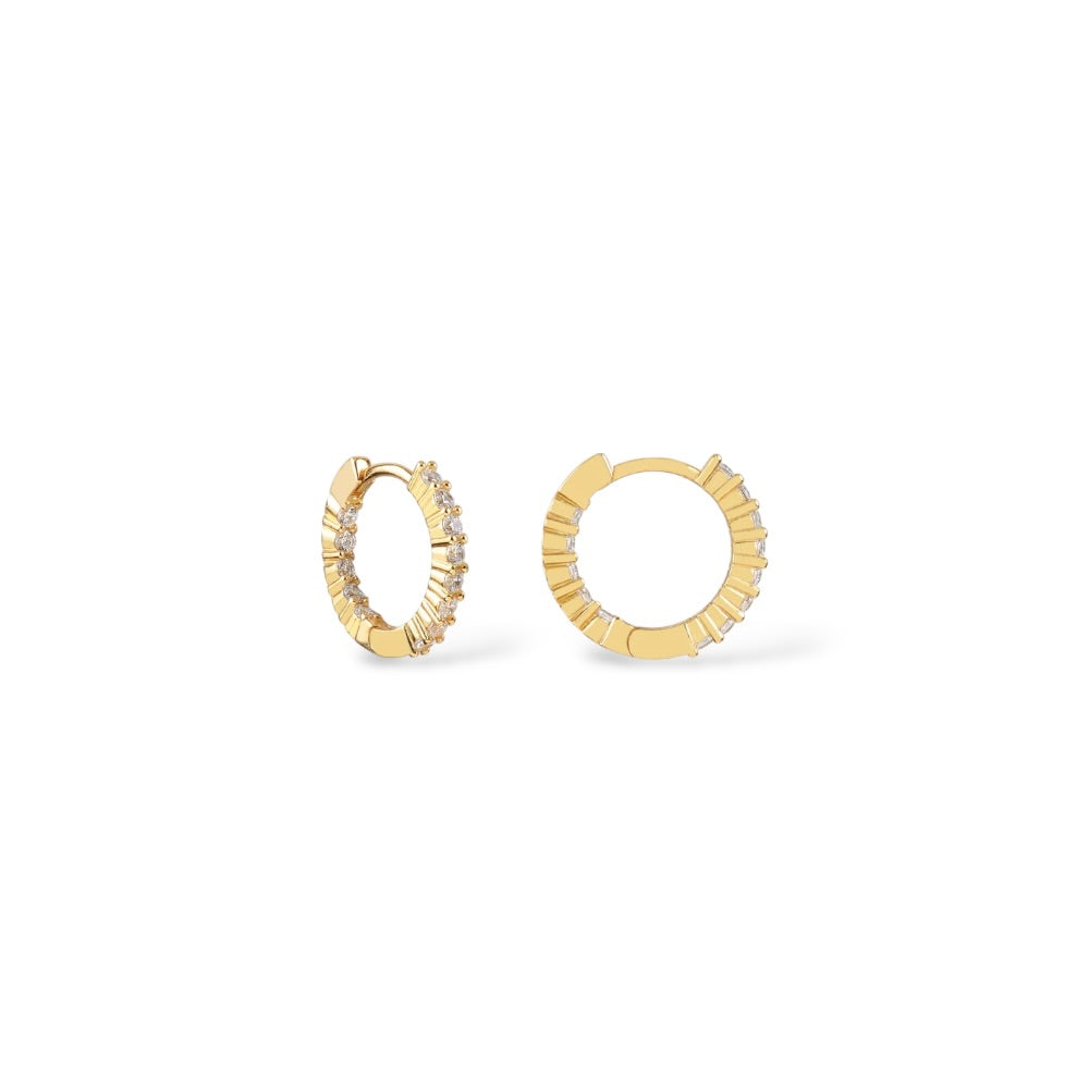 Aros en plata de ley 925 con baño dorado y detalle texturizado tipo rayos alrededor de toda la circunferencia. Incorporan circonitas en el frente para aportar brillo sutil y contraste con la estructura geométrica del diseño. Cierre tipo clic, seguro y cómodo para uso continuo. Tamaño medio, perfectos para elevar un look diario o complementar un styling más sofisticado. Acabado pulido de alto brillo.