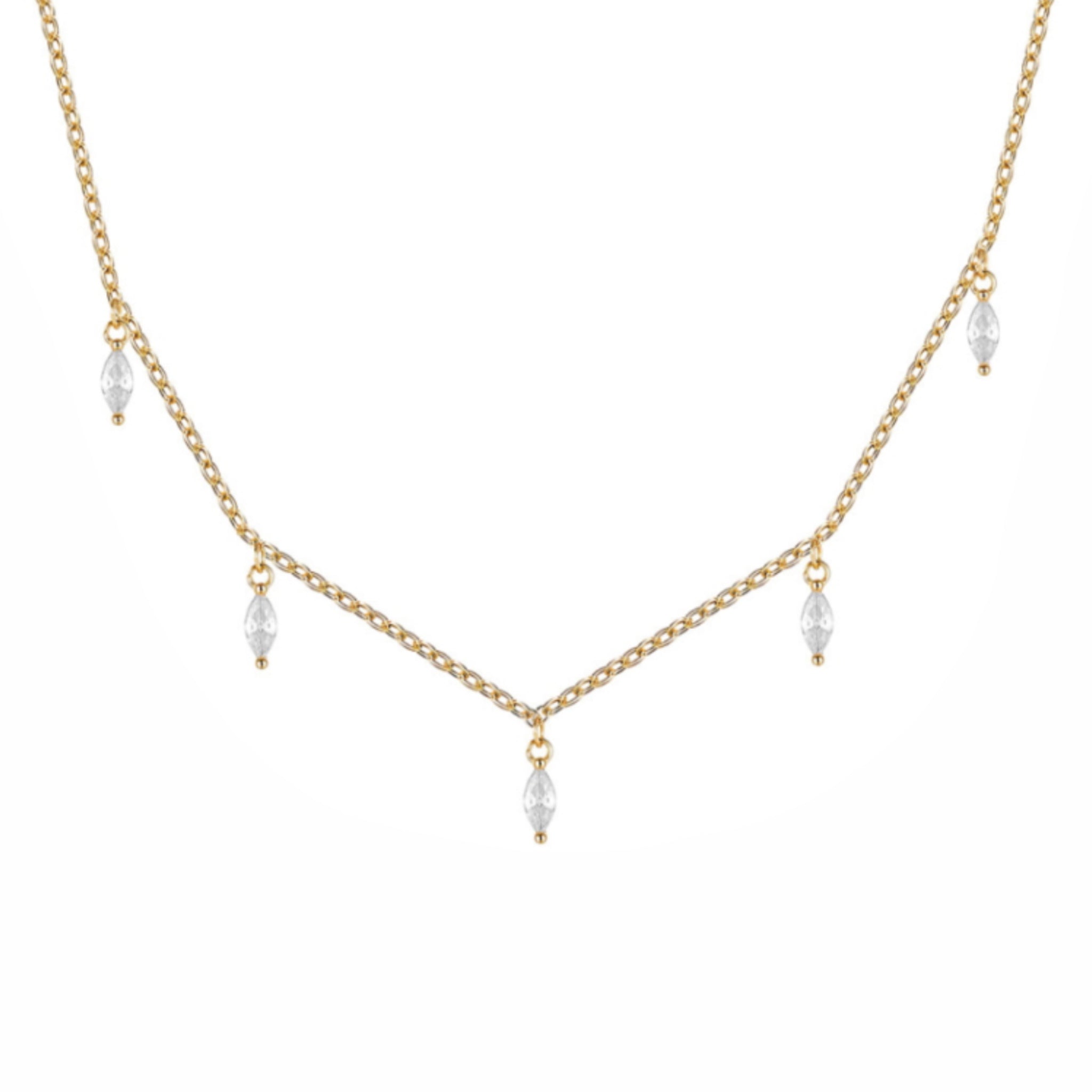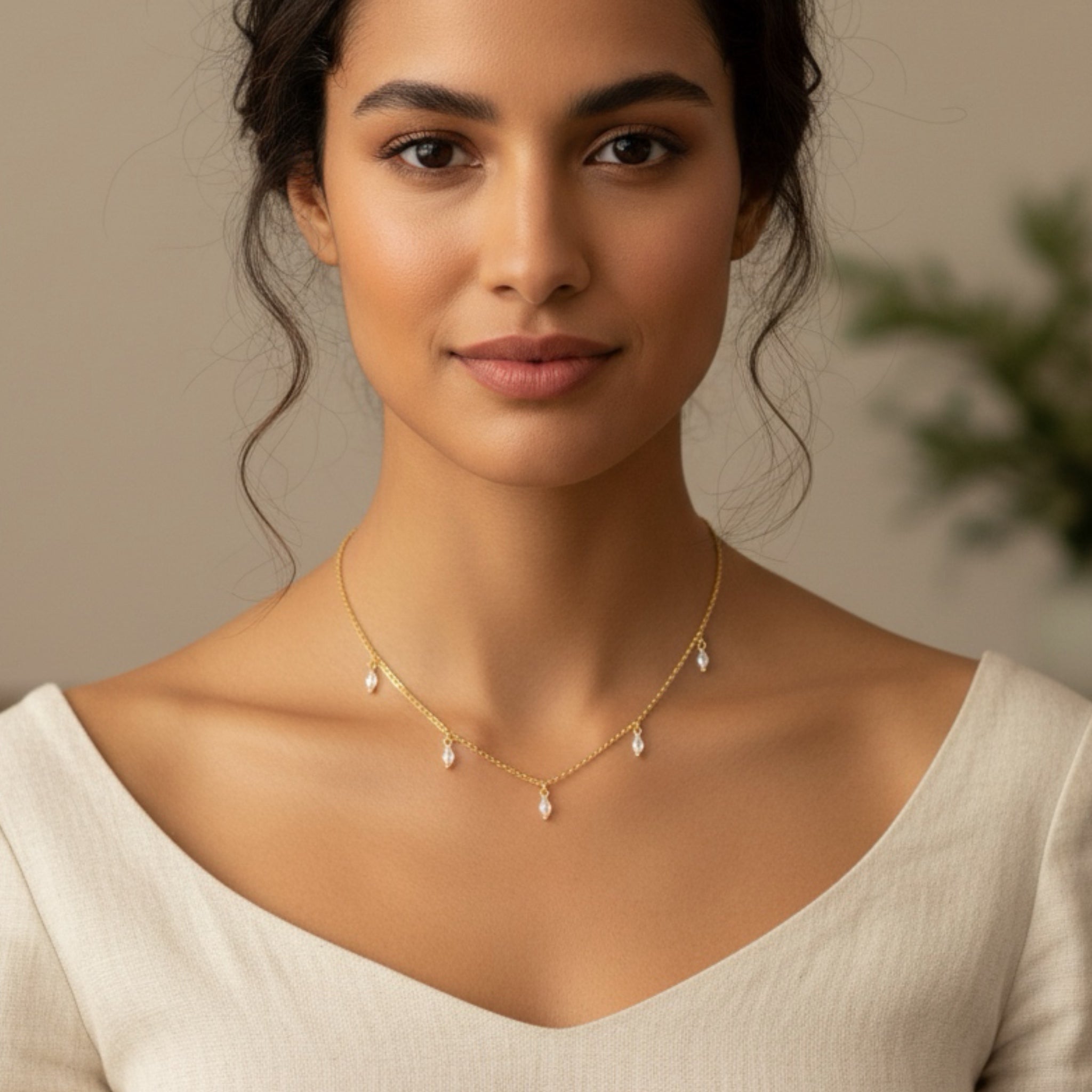 Collar de plata de ley chapada en oro de 18 kilates con cinco pequeñas circonitas facetadas que cuelgan suavemente a lo largo de la cadena.