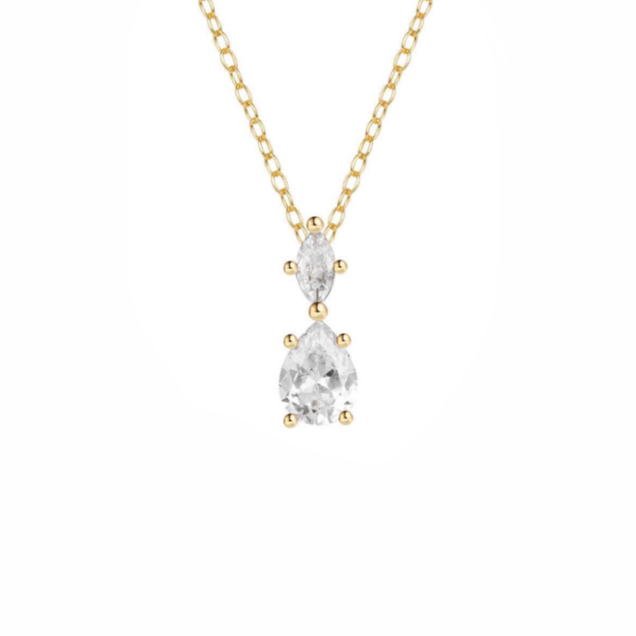 Collar elaborado en plata de ley bañada en oro 18K, con un colgante formado por dos circonitas transparentes en cortes marquise y lágrima. Su diseño delicado y luminoso aporta un toque elegante y refinado a cualquier look. Perfecto para ocasiones especiales o para añadir un destello de luz al día a día.