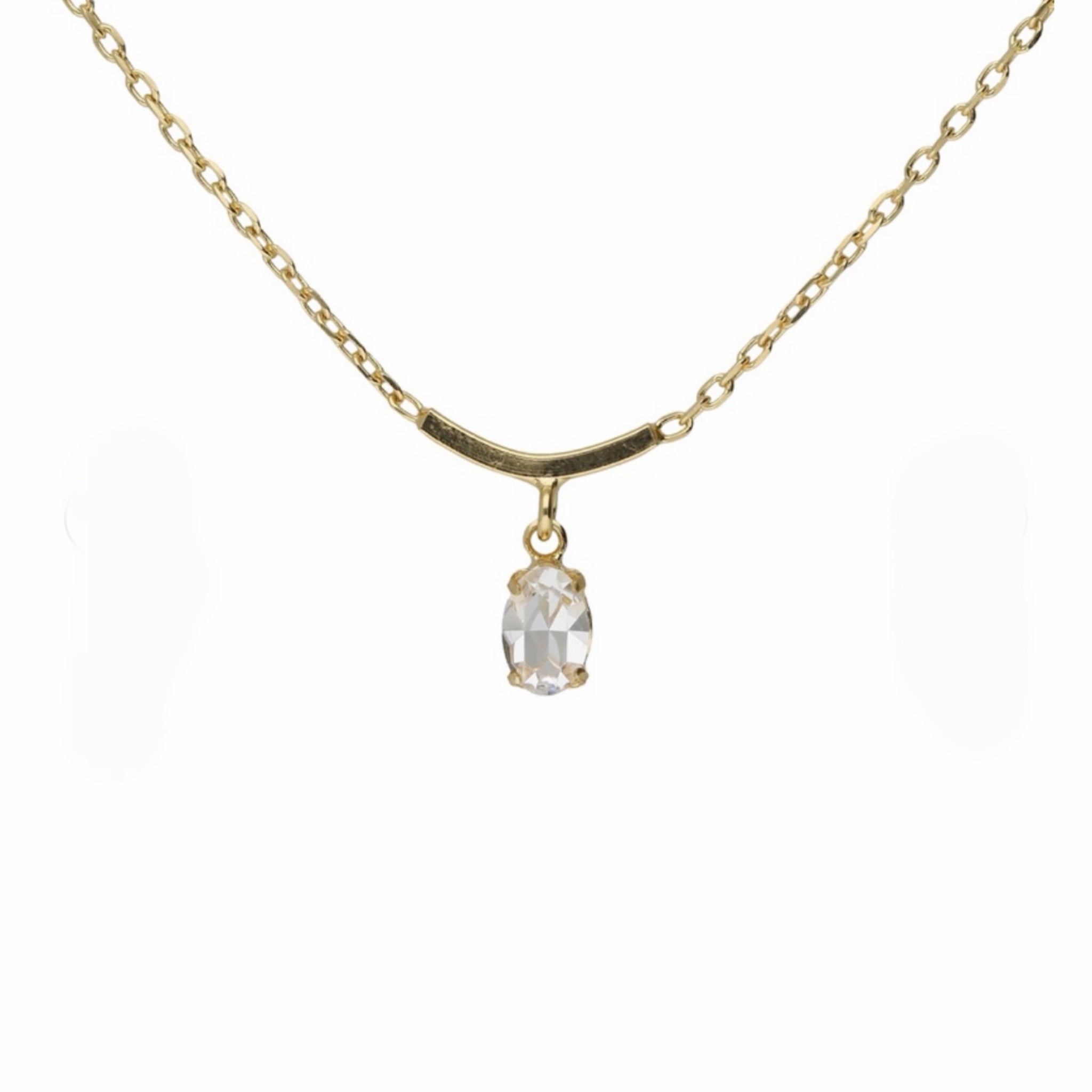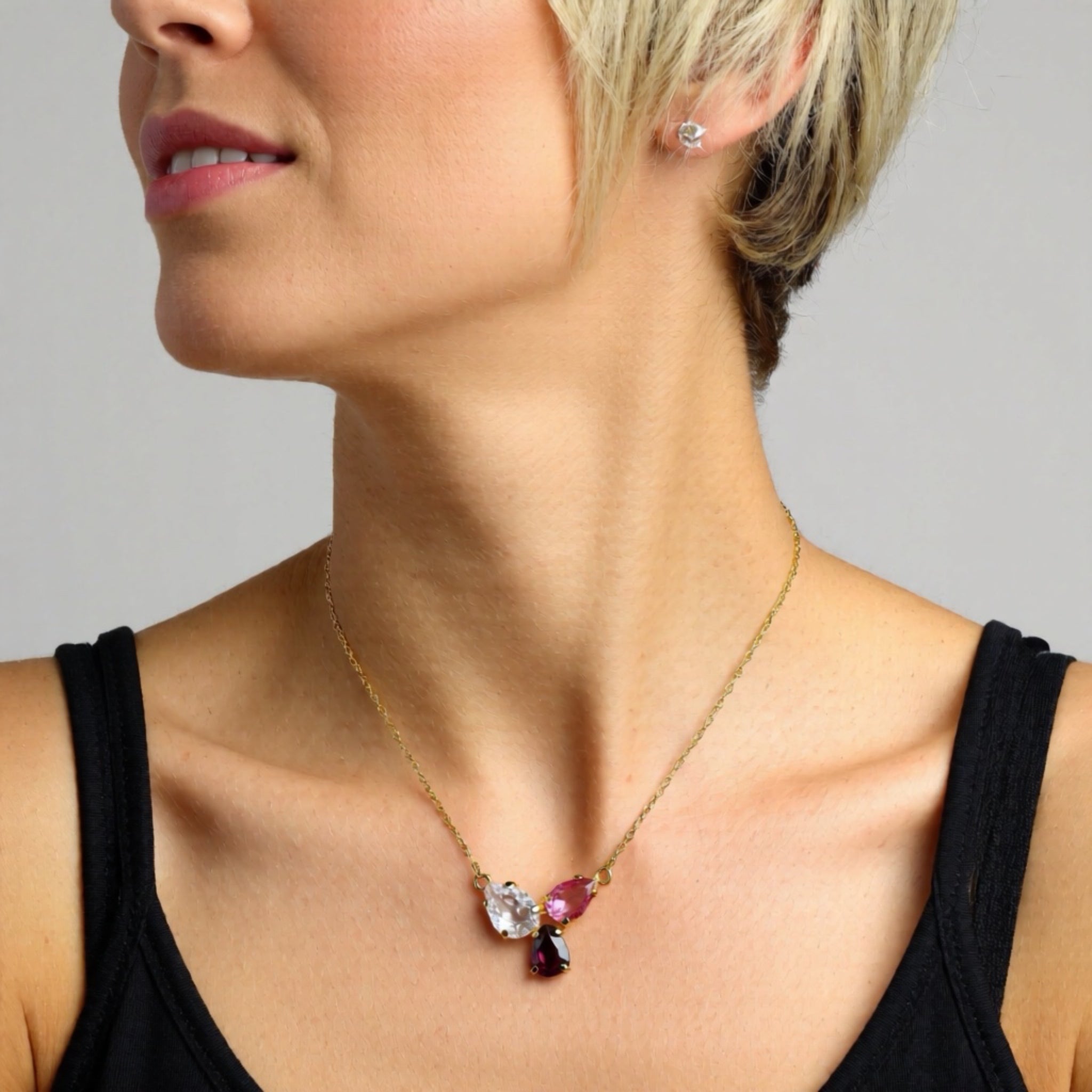 Collar en forma de flor elaborado en plata de ley 925 chapada en oro. Presenta tres cristales en talla lágrima que se unen de manera delicada, creando una composición armoniosa y luminosa. Los cristales en tonos rosa suave, burdeos profundo y transparente aportan un contraste equilibrado que realza el encanto y la elegancia de la pieza.