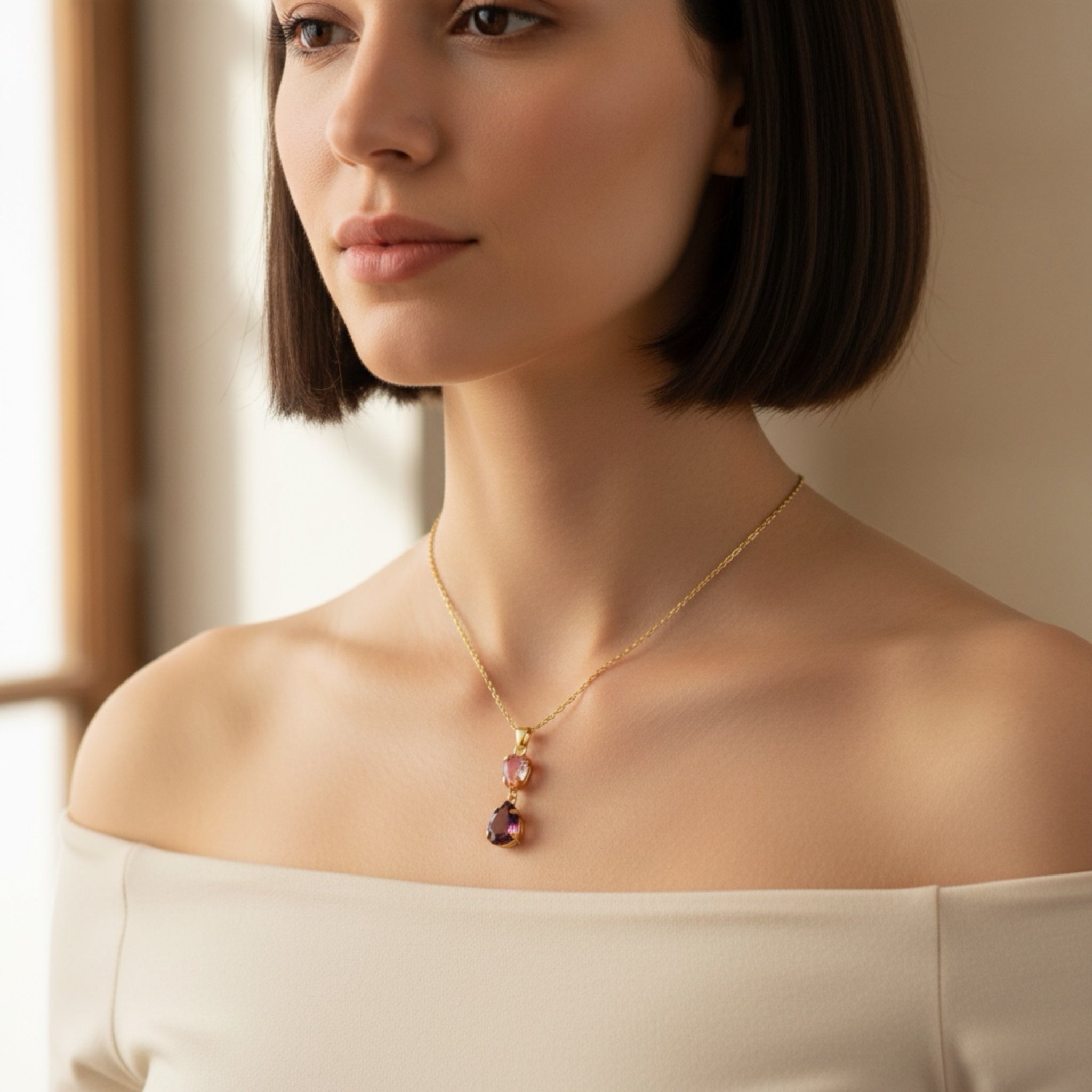 Collar en plata de ley 925 con baño en oro y dos cristales corte lágrima en tonos rosado y burdeos. Su diseño elegante combina delicadeza y profundidad, creando un contraste sofisticado que realza cualquier look, desde el día a día hasta ocasiones especiales.