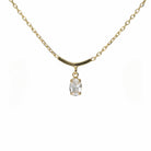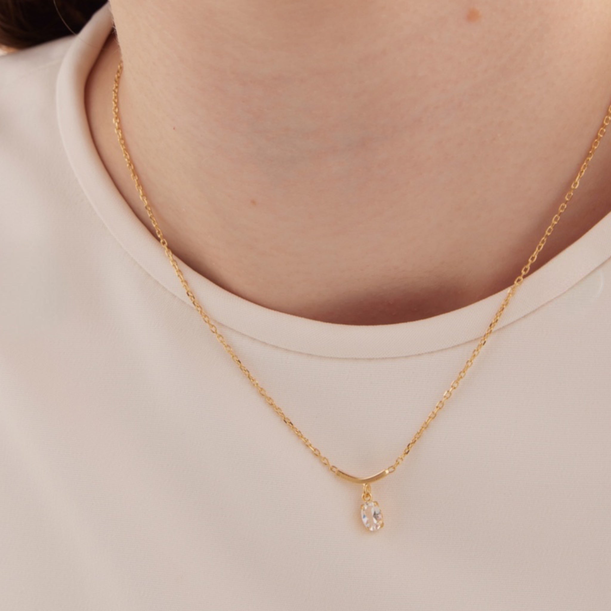 Collar elaborado en plata de ley bañada en oro 18K, con un diseño minimalista y elegante. Su cadena fina sostiene una barra curva de la que cuelga un cristal transparente de Swarovski con corte ovalado, que aporta un brillo sutil y sofisticado. Ideal para combinar con otros collares finos o lucir en solitario para un look atemporal. Perfecto para quienes buscan una joya discreta pero con un toque de luz.