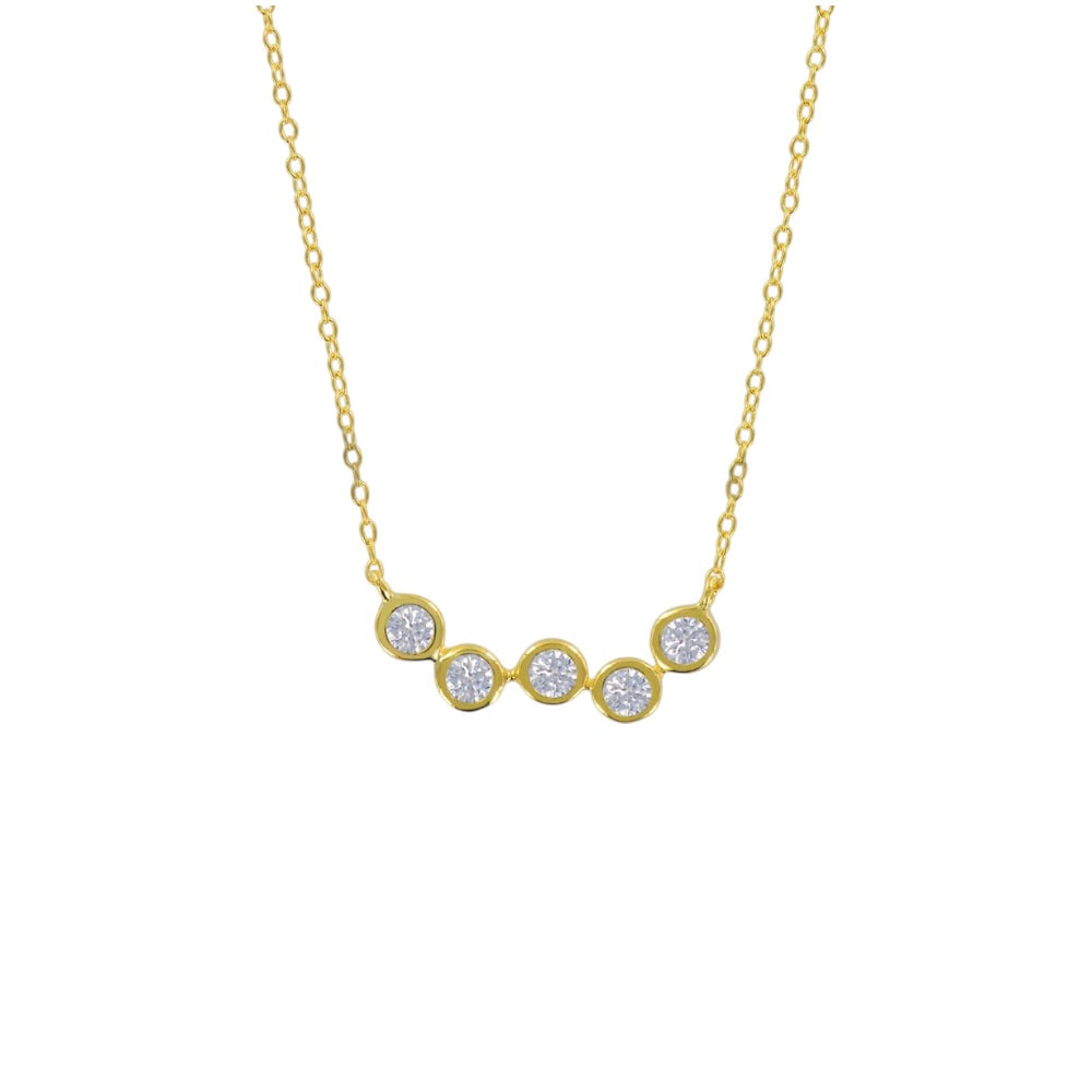 Un diseño limpio que habla por sí solo. Este collar combina la delicadeza de una cadena fina en tono dorado con cinco cristales blancos engastados en línea, creando un efecto de luz sutil que enmarca el escote con equilibrio y elegancia.
