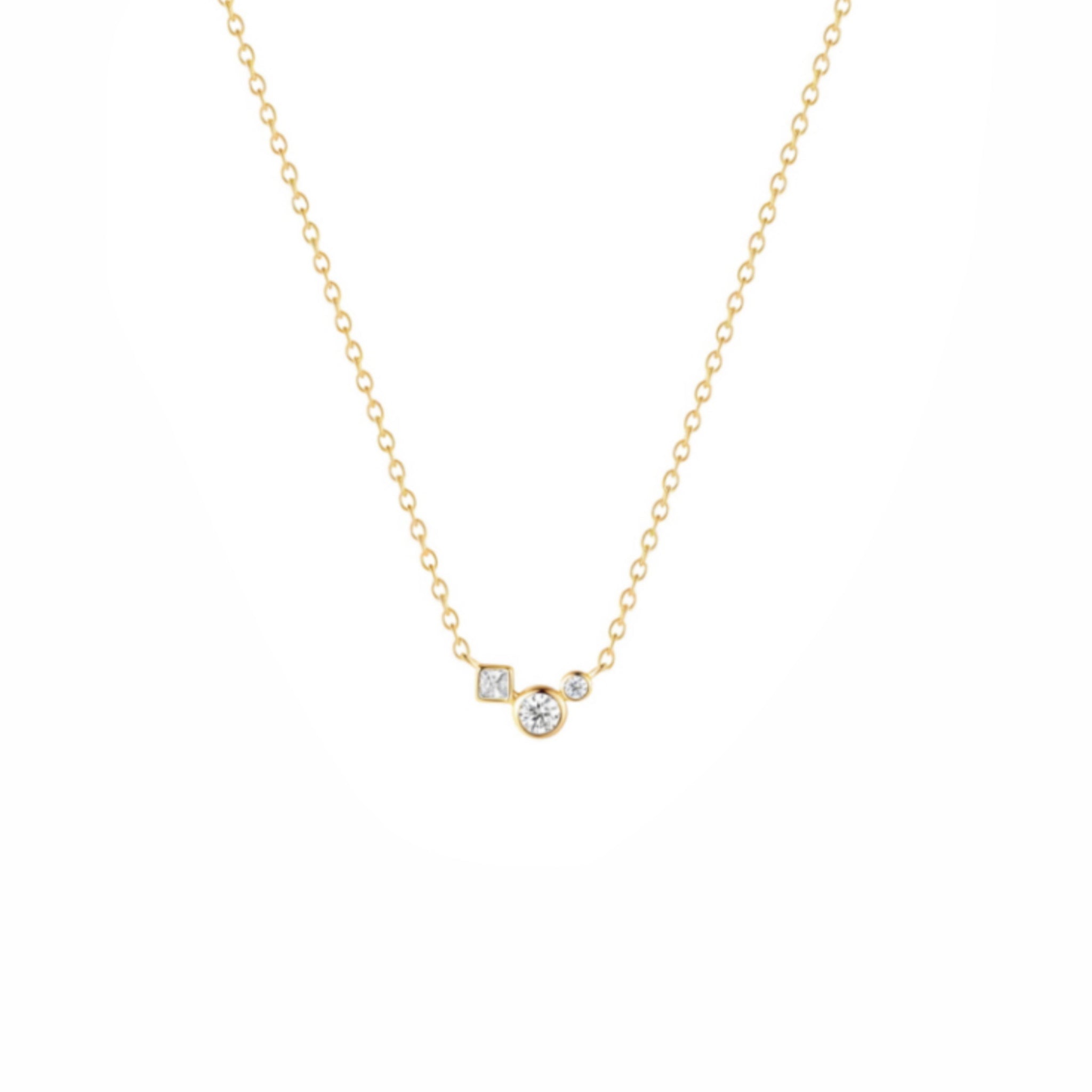 Descubre la elegancia sutil de este collar con un diseño minimalista que combina tres brillantes circonitas en diferentes cortes para crear un punto de luz delicado y sofisticado. Su cadena fina realza la armonía del colgante, convirtiéndolo en una pieza perfecta para el día a día o para complementar un look más especial. Ligero, moderno y atemporal: un imprescindible en cualquier colección.