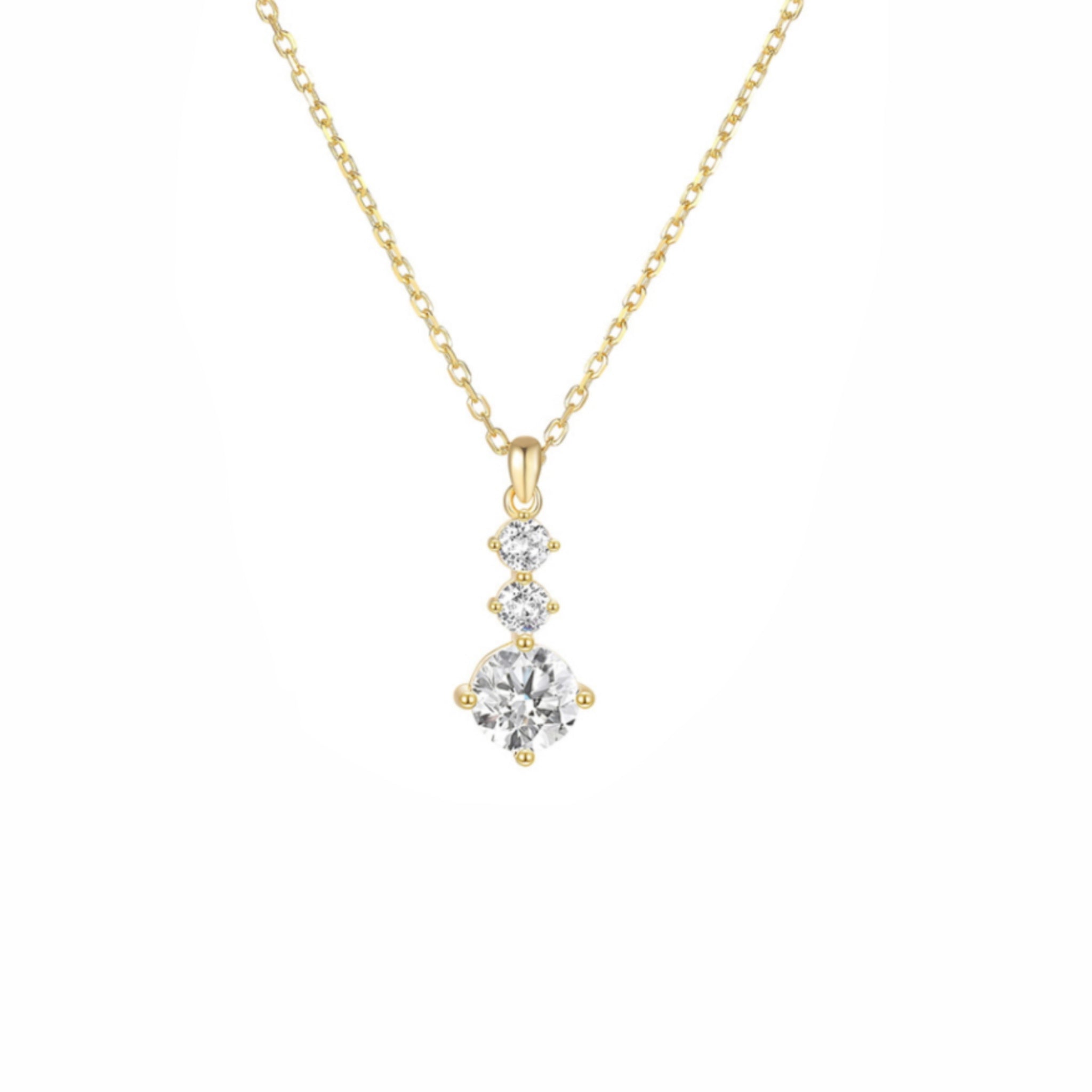 Descubre la sofisticación en su forma más pura con este collar de plata de ley 925 con baño de oro 18K. Su diseño minimalista presenta tres circonitas alineadas que convergen en una piedra central más prominente, creando un efecto luminoso que captura la atención sin resultar excesivo.