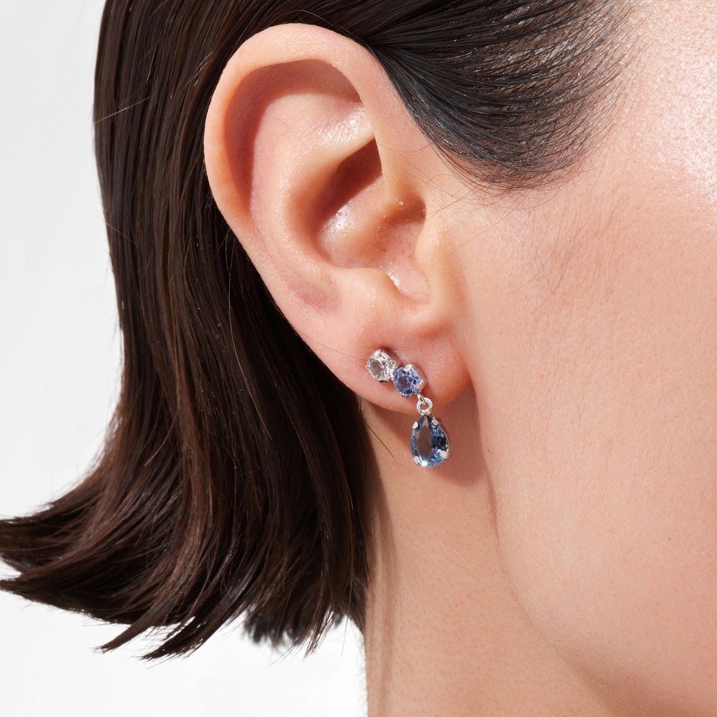 Un diseño delicado y sofisticado que combina luz y profundidad en una composición vertical armoniosa. Dos circonitas redondas en tonos cristal y azul claro aportan brillo y frescura en la parte superior, mientras que una circonita en forma de gota en azul noche añade intensidad y carácter.