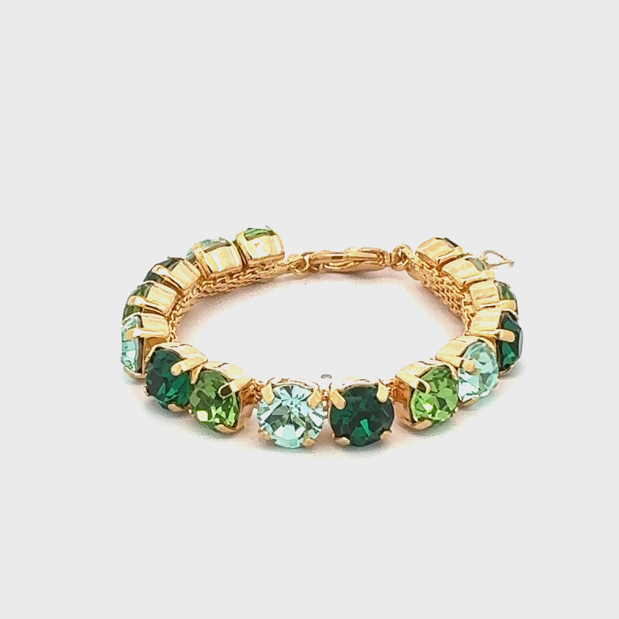 Esta pulsera está adornada con cristales en diferentes tonos de verde, desde esmeraldas intensas hasta tonos más suaves como peridotos o crisolitos. La combinación de estos tonos crea un efecto visual encantador y natural, perfecto para agregar un toque de frescura y sofisticación a tu estilo. Esta pulsera tenis en verde es una opción versátil que complementará cualquier conjunto, ya sea casual o formal. Sumérgete en la belleza de la naturaleza con esta deslumbrante pulsera de tenis.