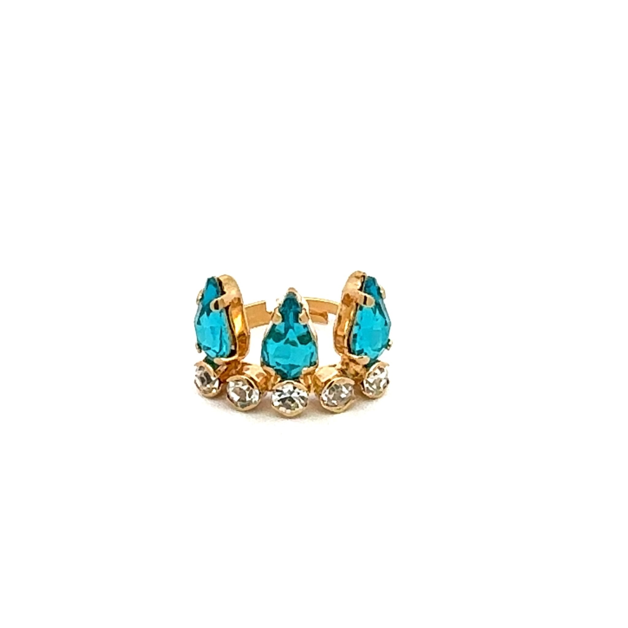 Esta sortija ajustable con baño de oro luce un diseño elegante que combina tres cristales en forma de lágrima en tono aguamarina, acompañados de una hilera de diminutos cristales blancos brillantes en su base. Su delicadeza y estilo versátil la convierten en el complemento ideal para iluminar cualquier look, tanto de día como de noche. Perfecta para usar sola o junto a otros anillos, esta joya realzará tu estilo con un toque de sofisticación y feminidad.