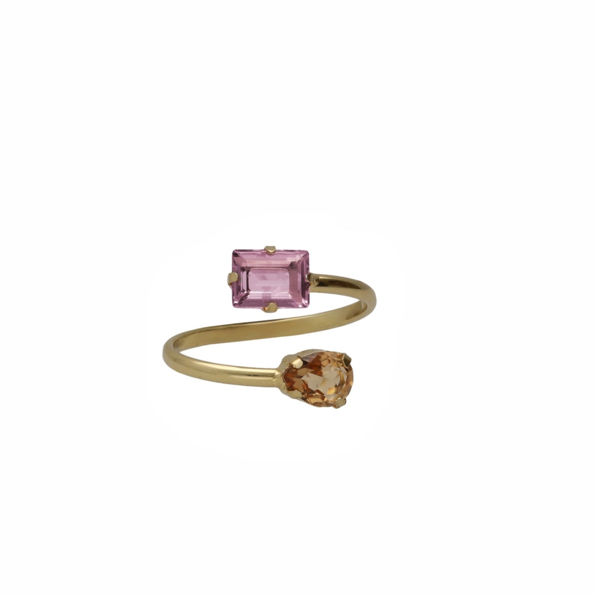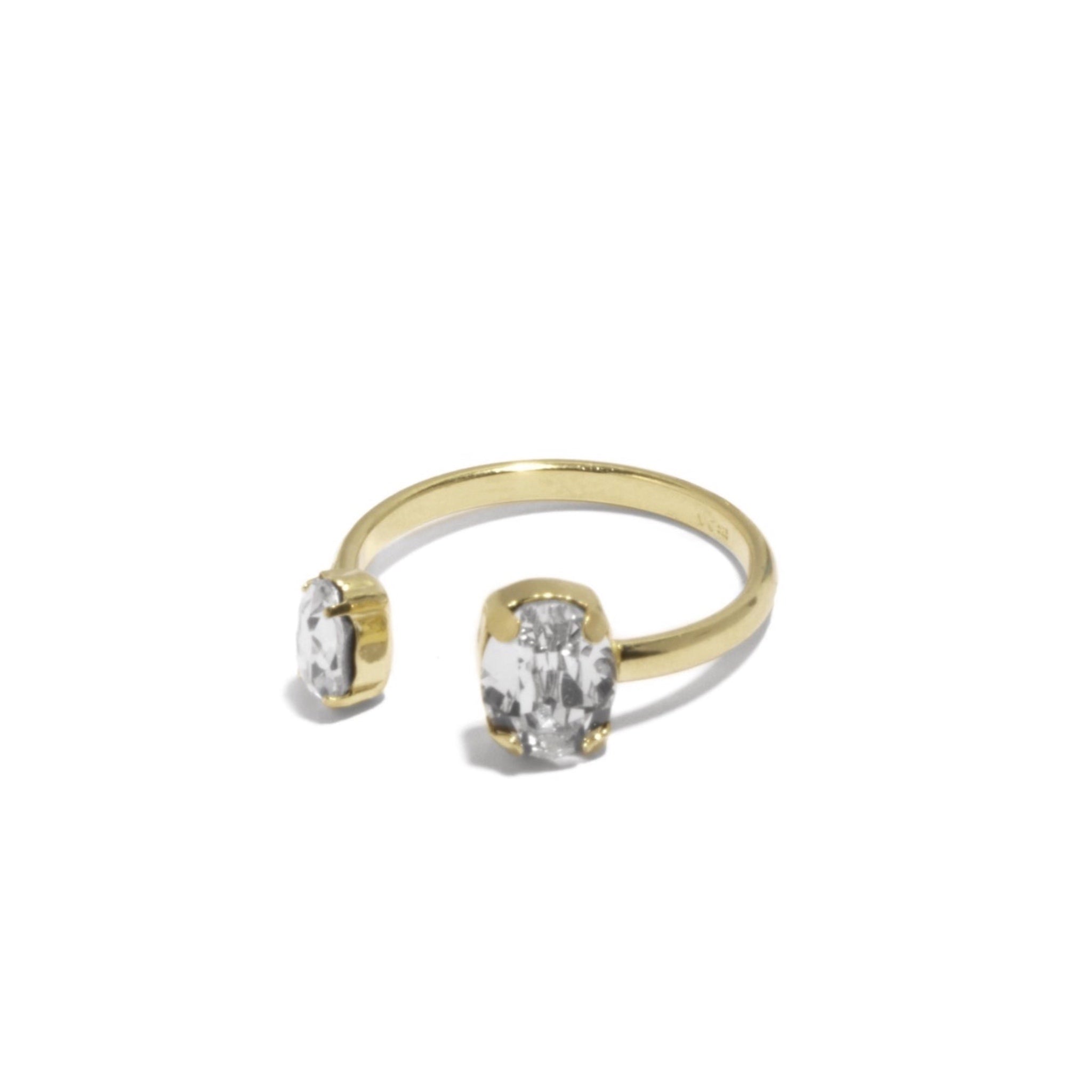Esta sortija en plata de ley chapada con 2 micras de oro de 18K es una pieza exquisita que combina lujo y versatilidad. El diseño ajustable asegura un ajuste perfecto para cualquier dedo, mientras que los dos cristales ovalados transparentes aportan un toque de elegancia y brillo. Fabricada con materiales de alta calidad, esta sortija garantiza durabilidad y comodidad. Ideal tanto para ocasiones especiales como para añadir un toque de sofisticación a tu estilo diario, esta sortija es una adición imprescindible a tu colección de joyería.