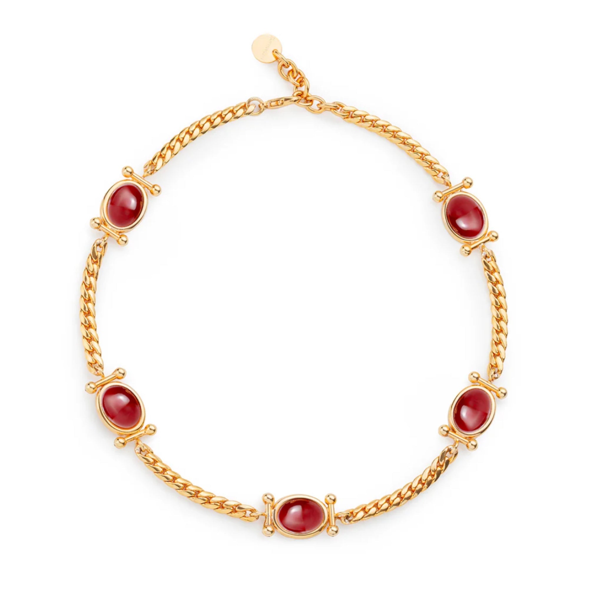 Este collar representa la esencia de la elegancia atemporal. Cada piedra burdeos, cuidadosamente pulida y montada en oro, irradia un brillo natural que captura la luz con gracia. La distribución simétrica de cinco gemas ovaladas crea una armonía visual que equilibra perfectamente cualquier conjunto, desde lo casual hasta lo formal.