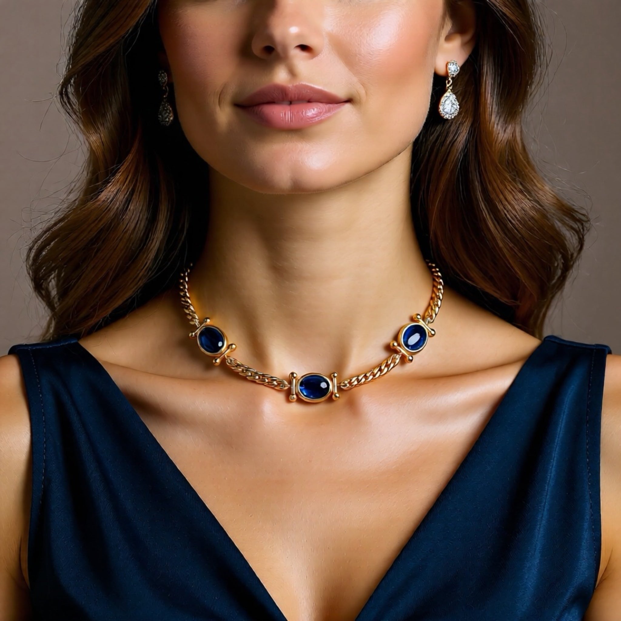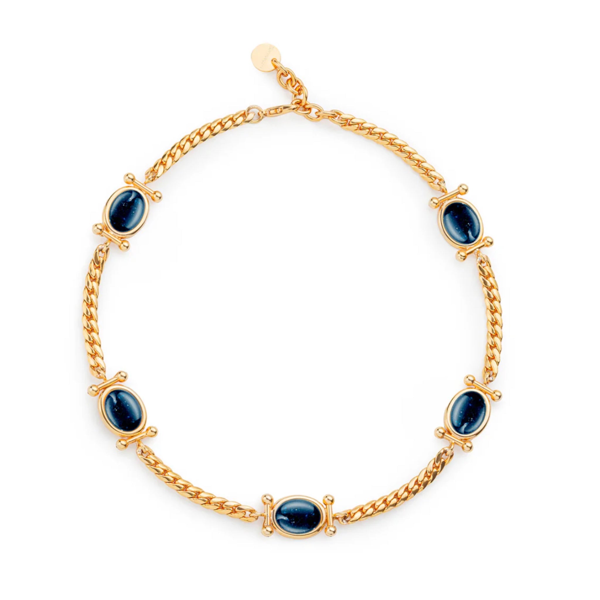 Descubre la sofisticación en su forma más pura con este collar que combina el azul lapislázuli y oro en una composición magistral. Cinco gemas ovaladas, meticulosamente seleccionadas y pulidas, se distribuyen en perfecta simetría para crear un efecto visual cautivador que refleja luz con elegancia natural. Esta pieza trasciende tendencias temporales, convirtiéndose en una declaración de buen gusto que complementa tanto tus looks cotidianos como tus momentos más especiales.