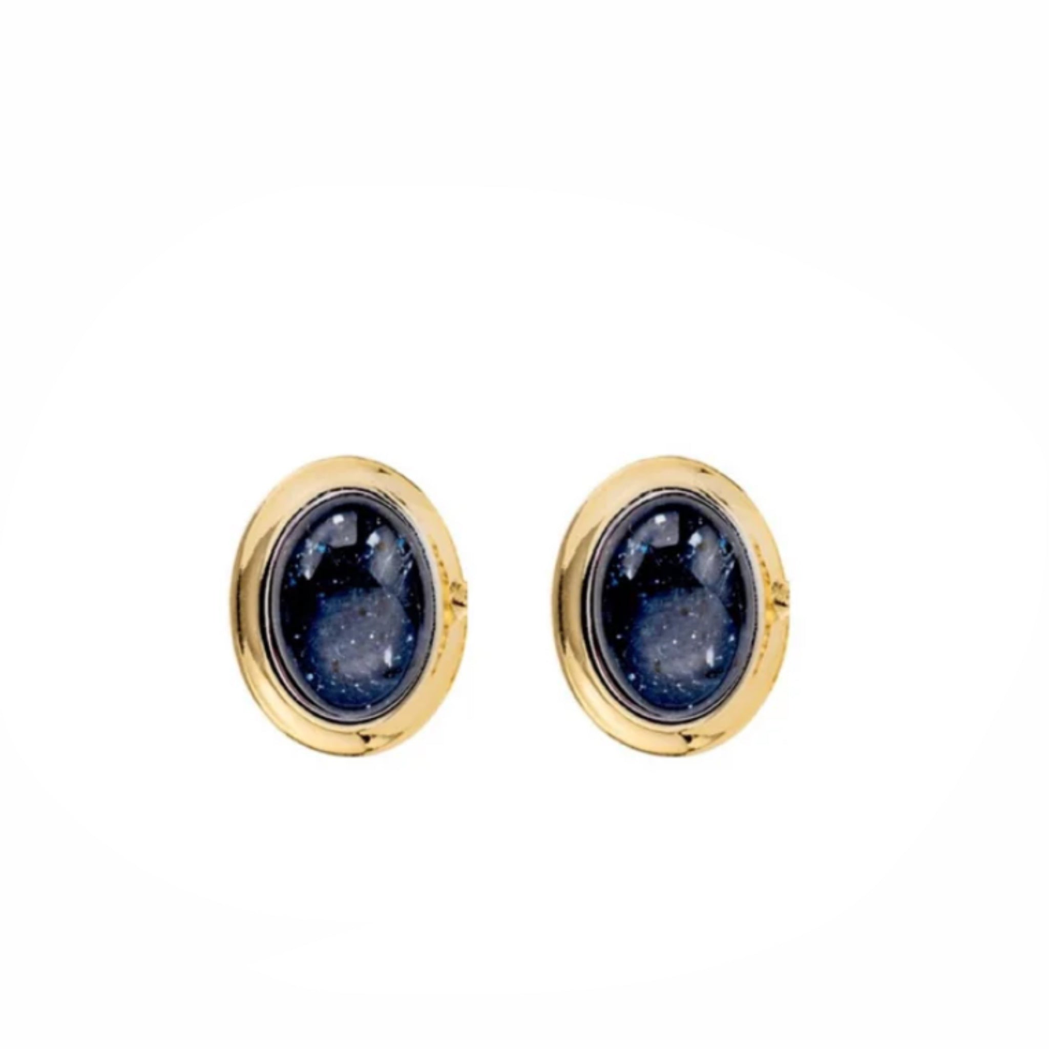 Estos pendientes ovalados combinan elegancia minimalista con un impacto visual cautivador. Su estructura dorada enmarca una piedra sintética en un profundo tono azul lapislázuli que evoca sofisticación y confianza. Aunque discretos en tamaño, transmiten una presencia innegable gracias a ese color intenso y envolvente.