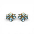 Pendientes con diseño floral de inspiración joya, compuestos por cristales en tonos azul claro y azul profundo que crean volumen y juego de luz. El cristal central en tono opal aporta suavidad y contraste, mientras que los detalles dorados realzan la composición con un acabado elegante y refinado. Una pieza equilibrada entre sofisticación y frescura, ideal tanto para eventos especiales como para elevar looks más neutros.