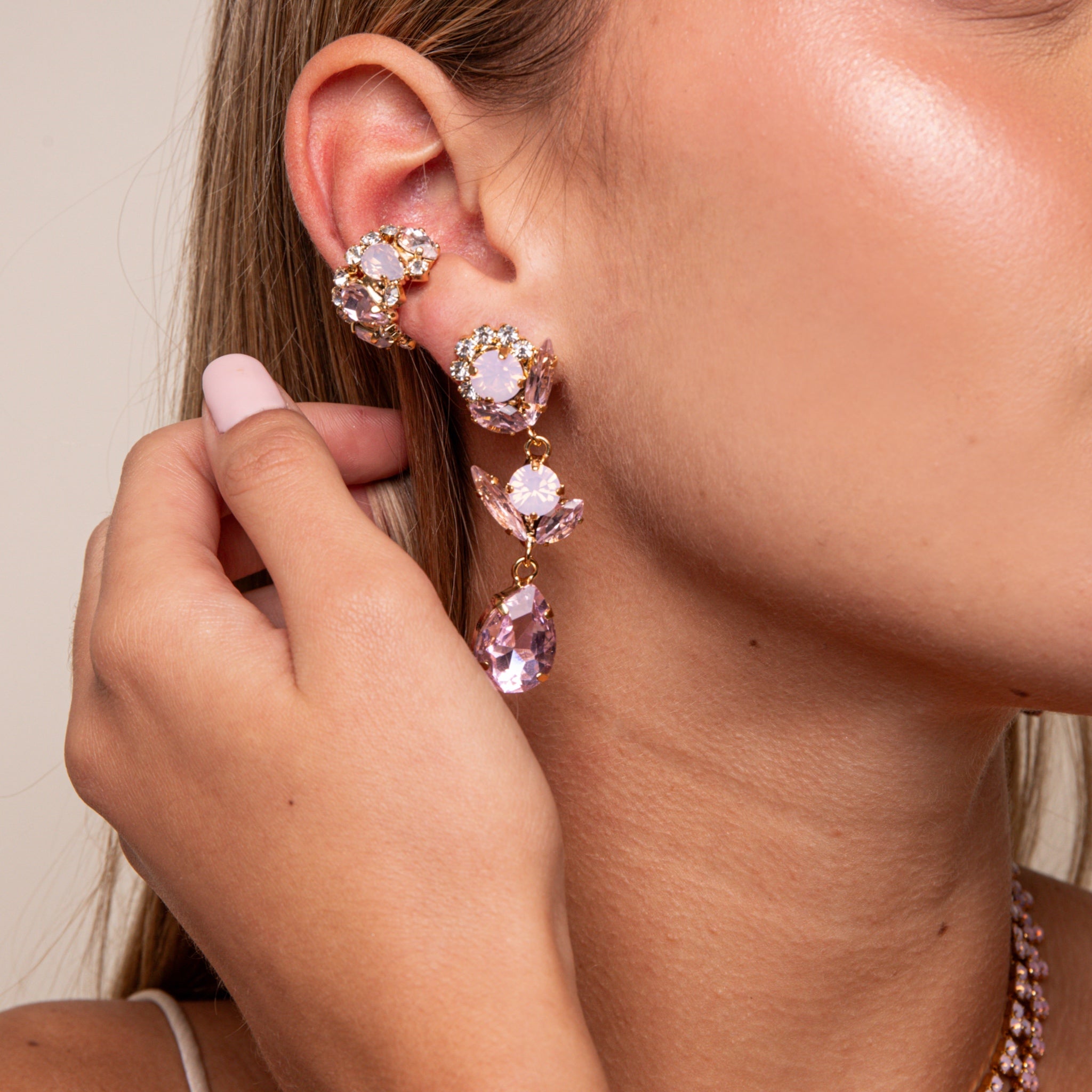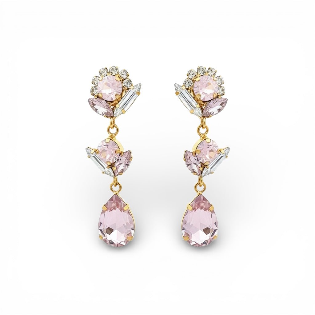 Deslumbra con estos pendientes colgantes de cristales Swarovski en tono rosa palo, una joya que combina elegancia y feminidad en cada detalle. Su diseño dorado realza la luminosidad de los cristales tallados en diferentes formas, redonda, marquesa y lágrima, creando un juego de luz sofisticado y delicado. Ideales para ocasiones especiales o para elevar un look cotidiano con un toque romántico y refinado.