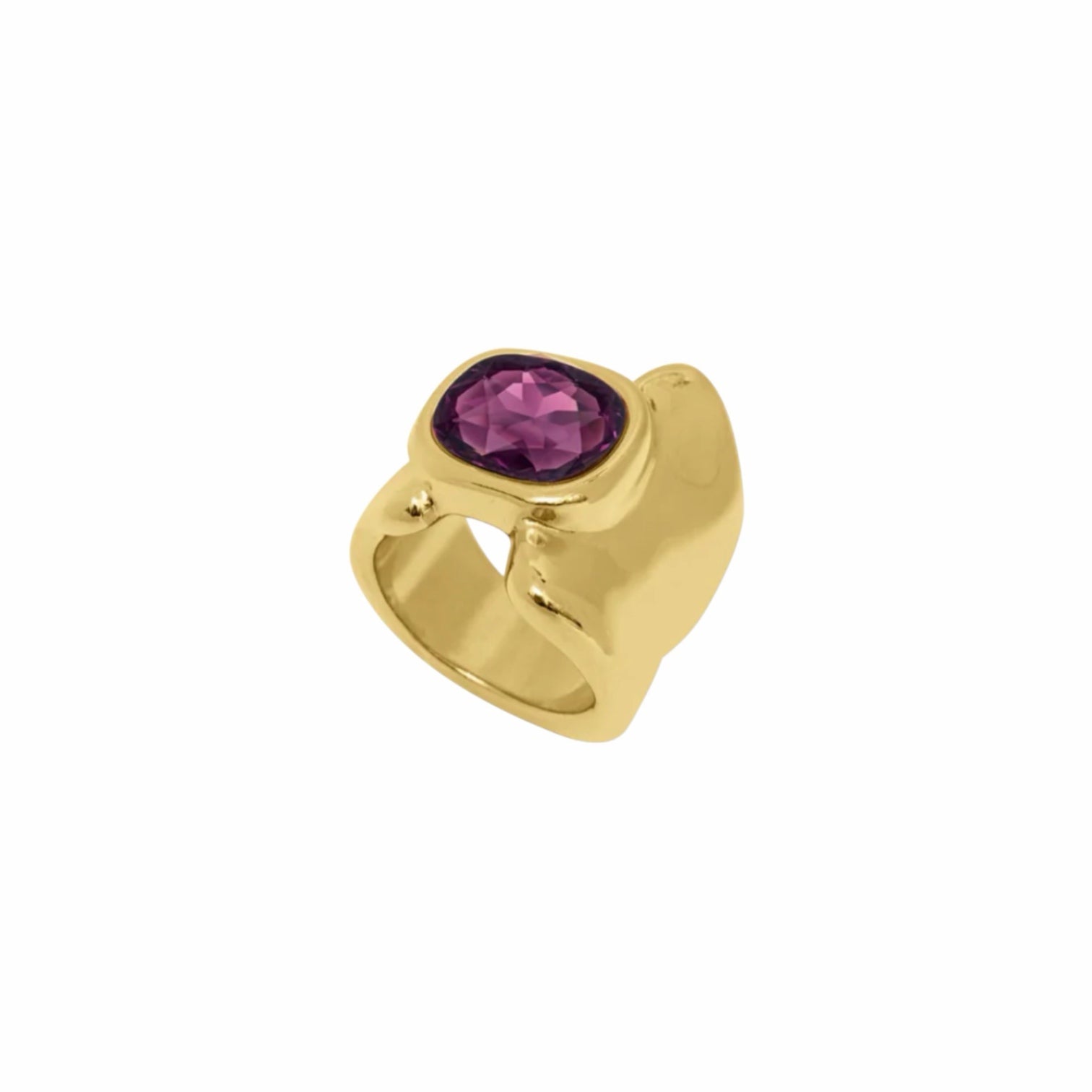 Sortija dorada con cristal Swarovski en tono amatista, una pieza que combina brillo y sofisticación. El violeta de su piedra facetada aporta un aire de distinción y elegancia atemporal, convirtiéndola en el accesorio perfecto para realzar cualquier look.