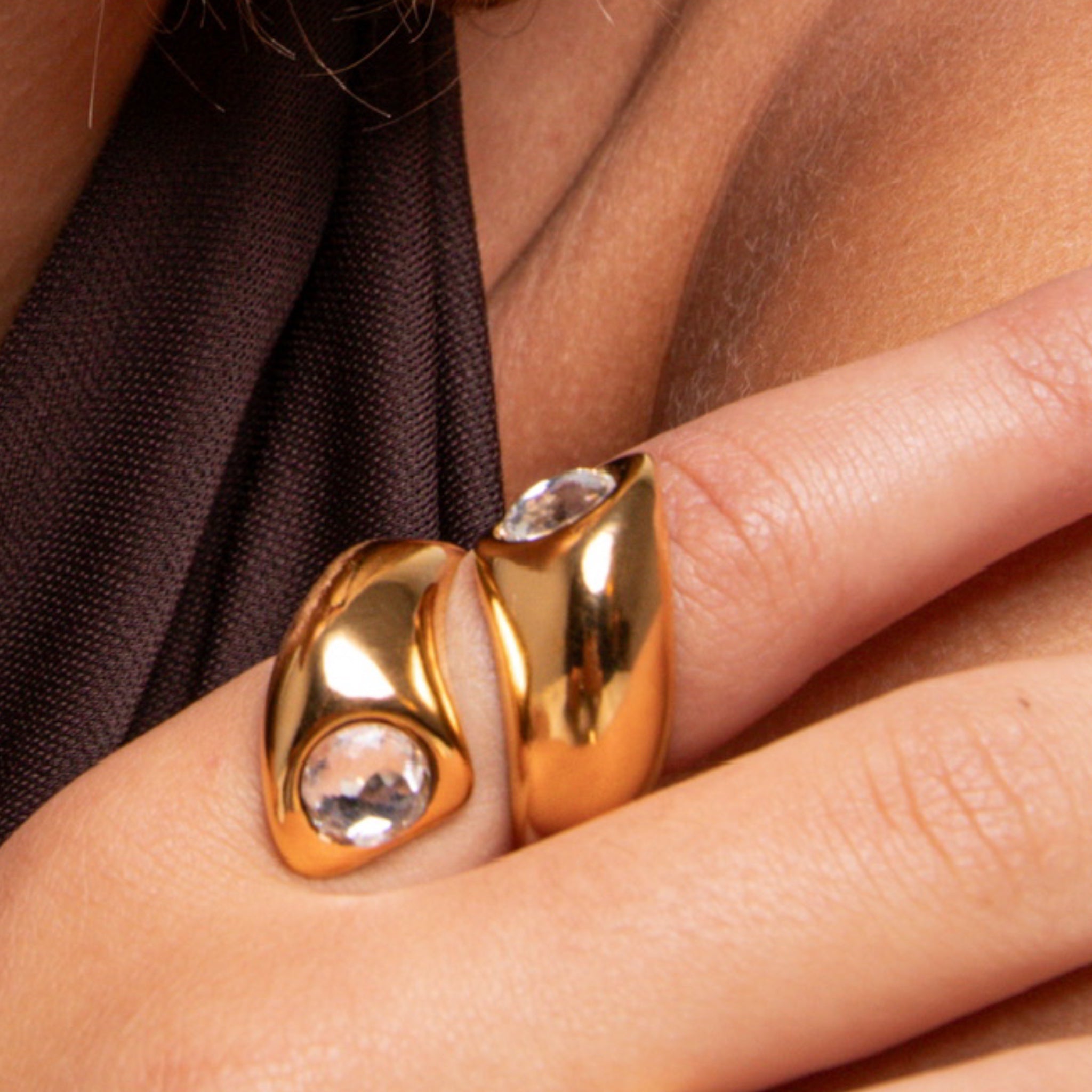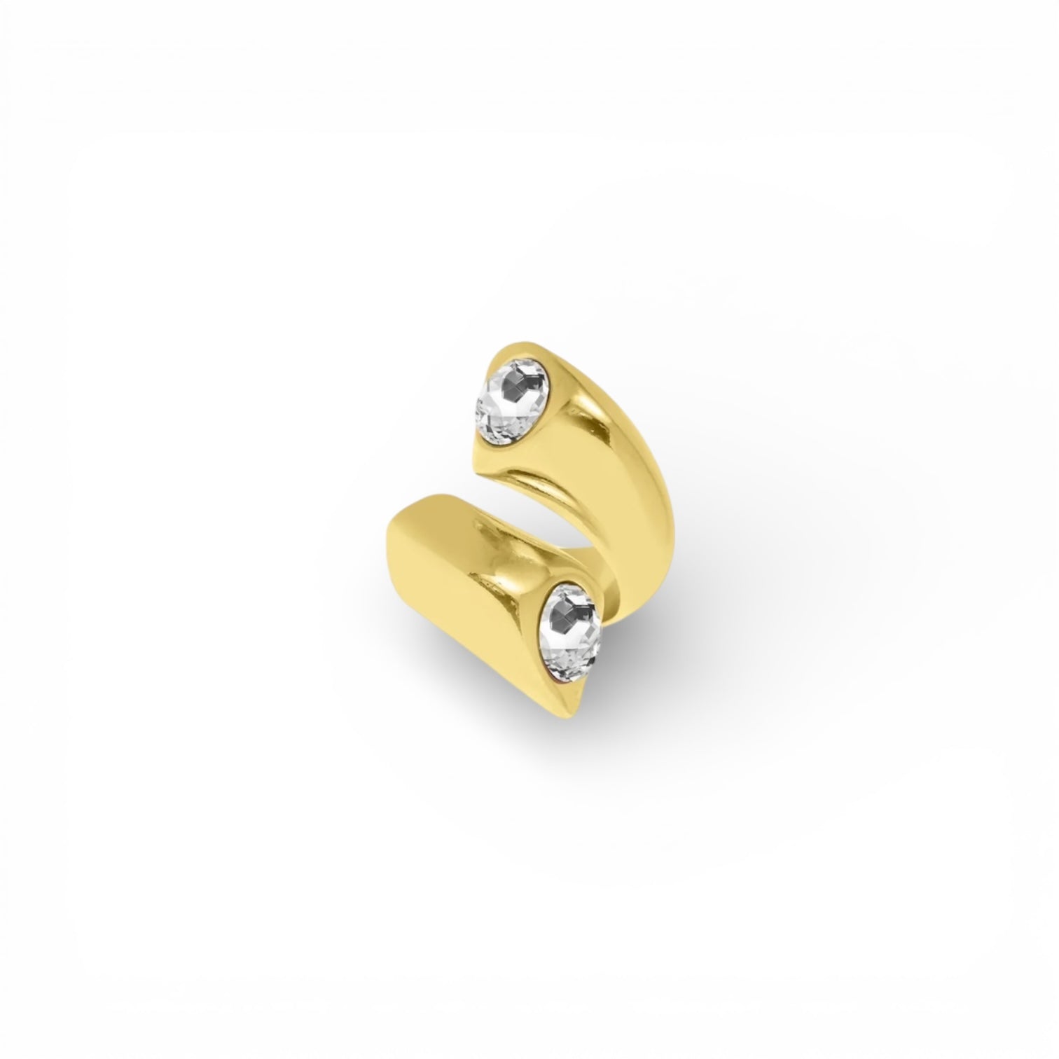 Sortija abierta con baño de oro de 24 quilates que combina elegancia contemporánea con un toque de lujo accesible. Los dos cristales transparentes estratégicamente colocados capturan la luz de forma hipnotizante, añadiendo dramatismo y sofisticación a tu presencia.