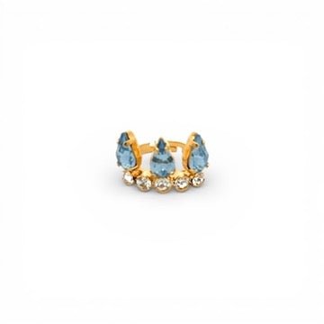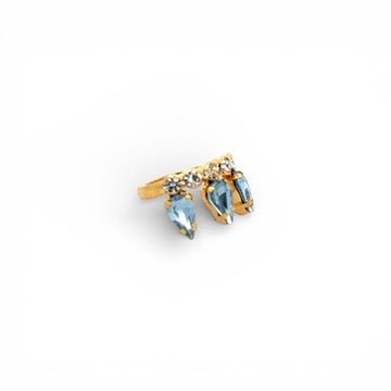 Esta sortija ajustable con baño de oro destaca por su diseño refinado, con tres cristales en forma de lágrima en tono zafiro claro y una fila de pequeños cristales blancos brillantes en su base. Su delicadeza y versatilidad la hacen perfecta para añadir un toque de luz a cualquier conjunto, ya sea de día o de noche. Ideal para llevar sola o combinada con otros anillos, esta joya aportará elegancia y feminidad a tu estilo.