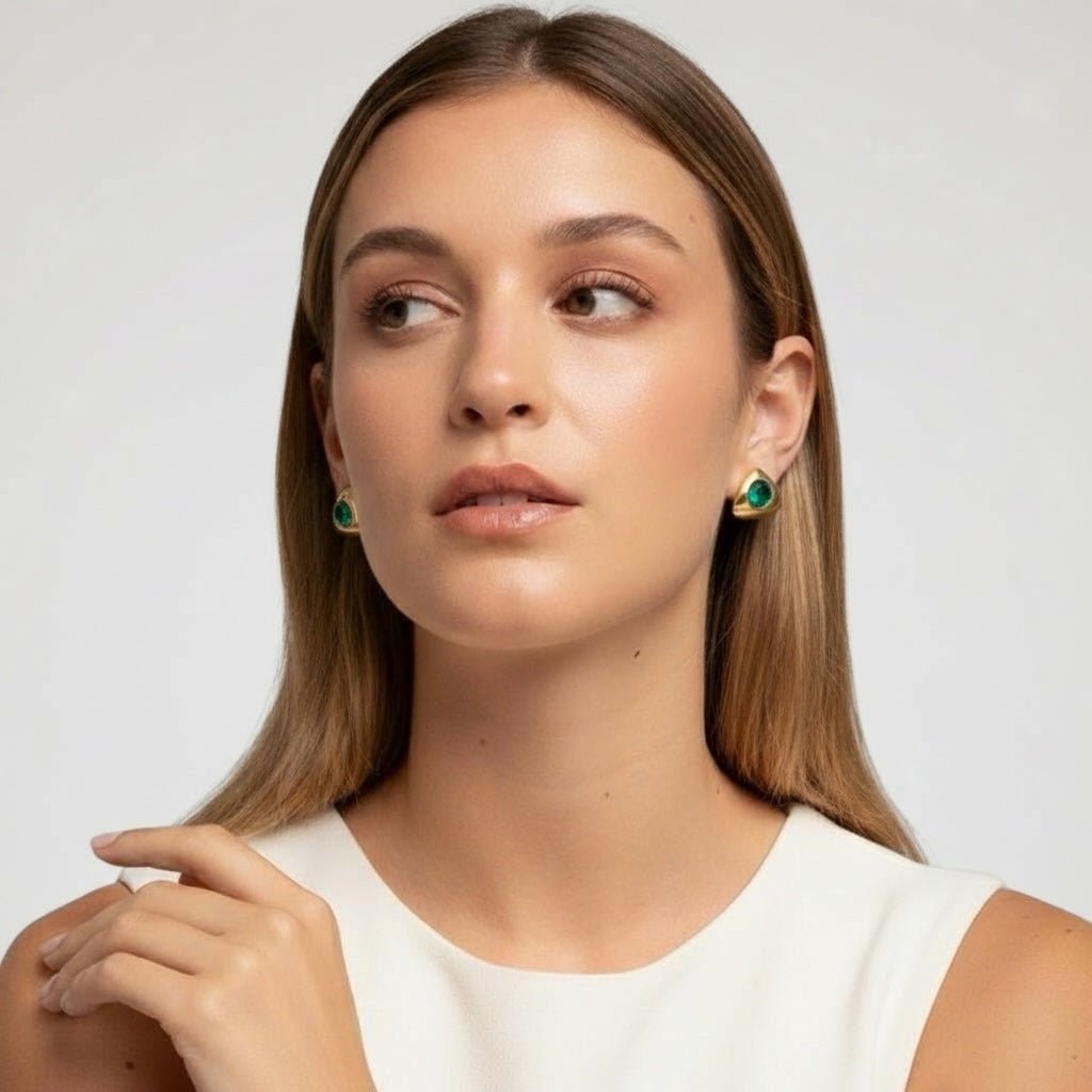 Descubre la sofisticación en su forma más pura con estos pendientes triangulares que fusionan geometría contemporánea con lujo accesible. El cristal esmeralda captura la luz de manera cautivadora, mientras que el chapado en oro de 24 quilates envuelve cada detalle con un brillo duradero y refinado. Su silueta minimalista trasciende tendencias, adaptándose sin esfuerzo a tu estilo diario o a tus momentos más especiales. Una inversión en elegancia discreta que transforma cualquier look con ese toque de distinción que solo los detalles bien pensados pueden aportar.