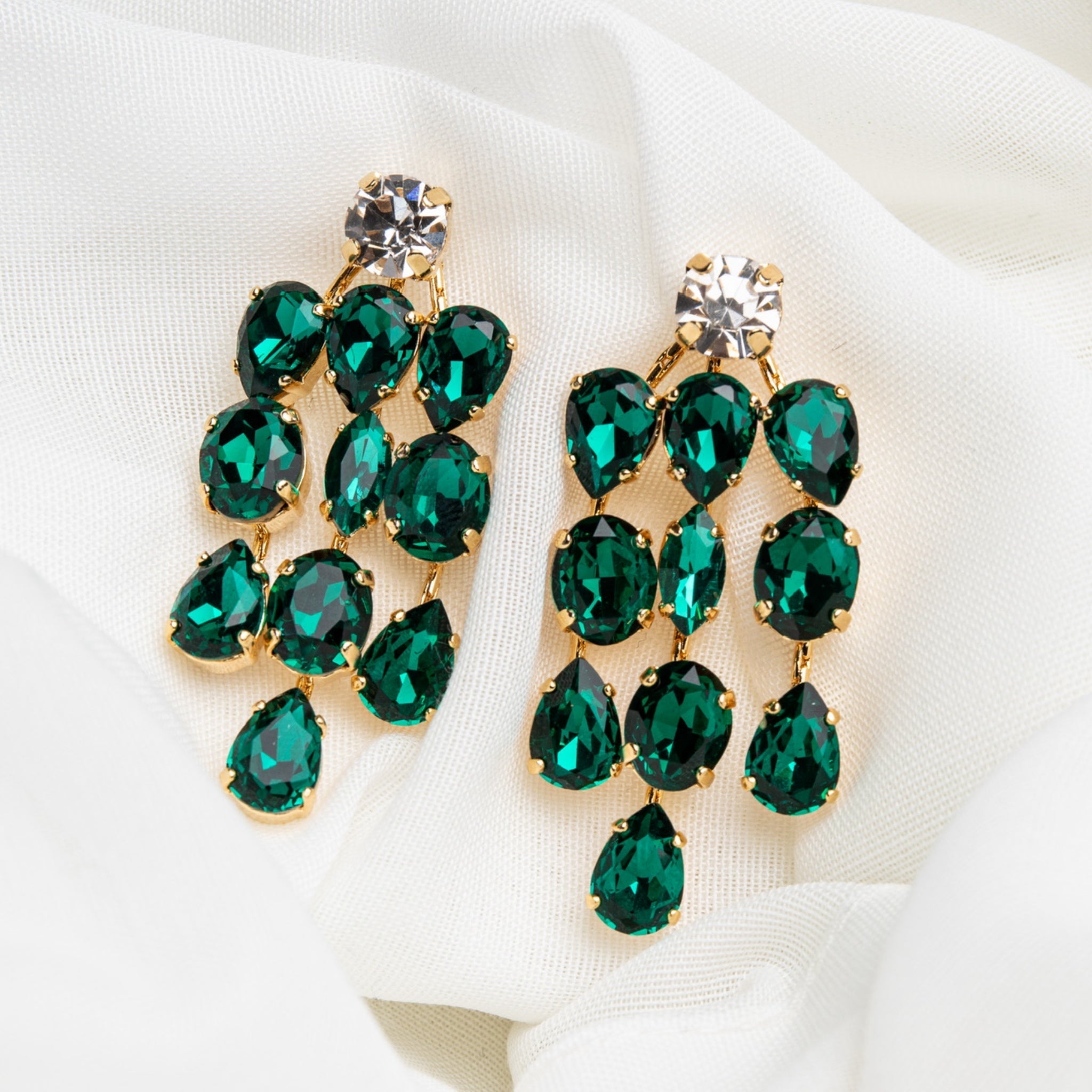 Estos pendientes destacan por un diseño sofisticado y muy llamativo, compuesto por una cascada de cristales verdes intensos que aportan profundidad, brillo y un fuerte impacto visual. La disposición vertical de las piedras crea movimiento y estiliza el rostro, mientras que el cristal transparente superior aporta luz y equilibrio al conjunto. Su estética joyera y elegante los convierte en unos pendientes statement ideales para ocasiones especiales, eventos nocturnos o para elevar un look con carácter y personalidad.
