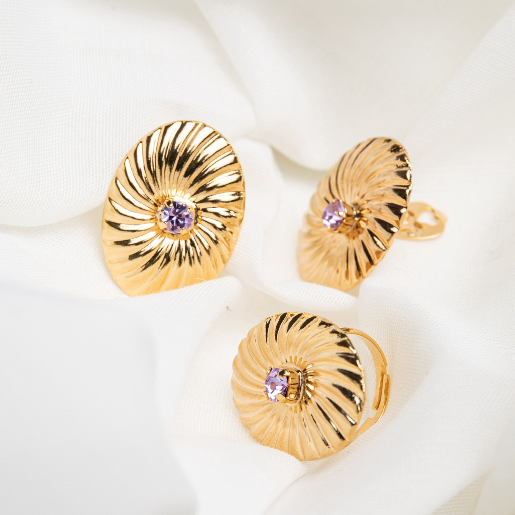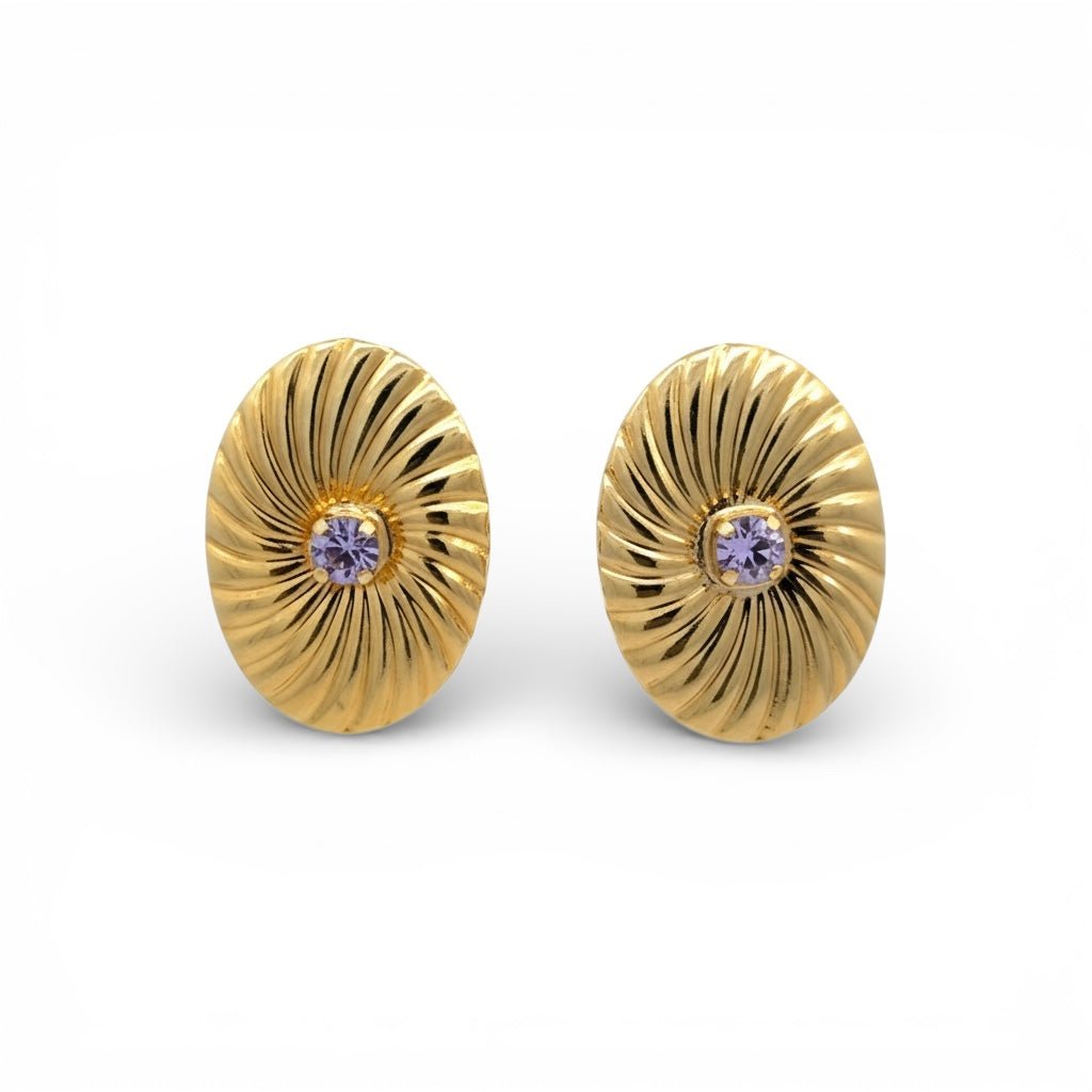 Estos pendientes destacan por un diseño radial y luminoso, inspirado en la fuerza y el movimiento del sol. Las líneas doradas estriadas se expanden desde el centro, donde un cristal en tono lila aporta un contraste delicado y sofisticado. Su forma ovalada y su volumen definido les confieren una presencia elegante y favorecedora, iluminando el rostro con un brillo cálido y muy joyero. Son unos pendientes statement, ideales para aportar carácter, luz y personalidad tanto a looks de día como de noche.