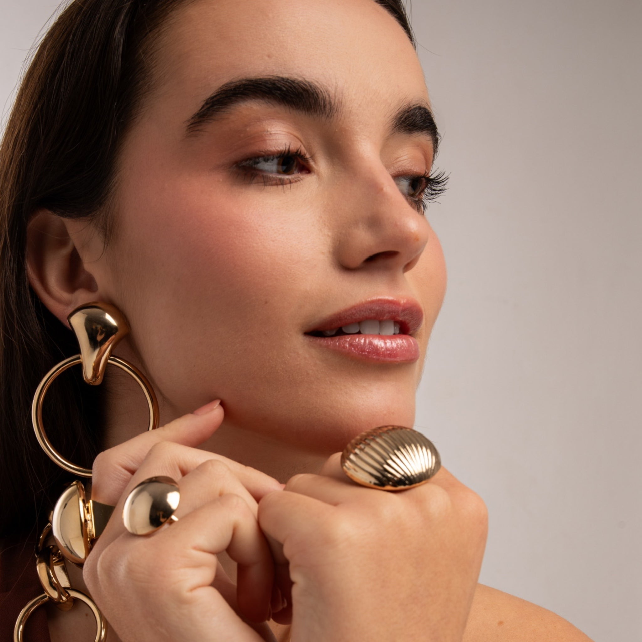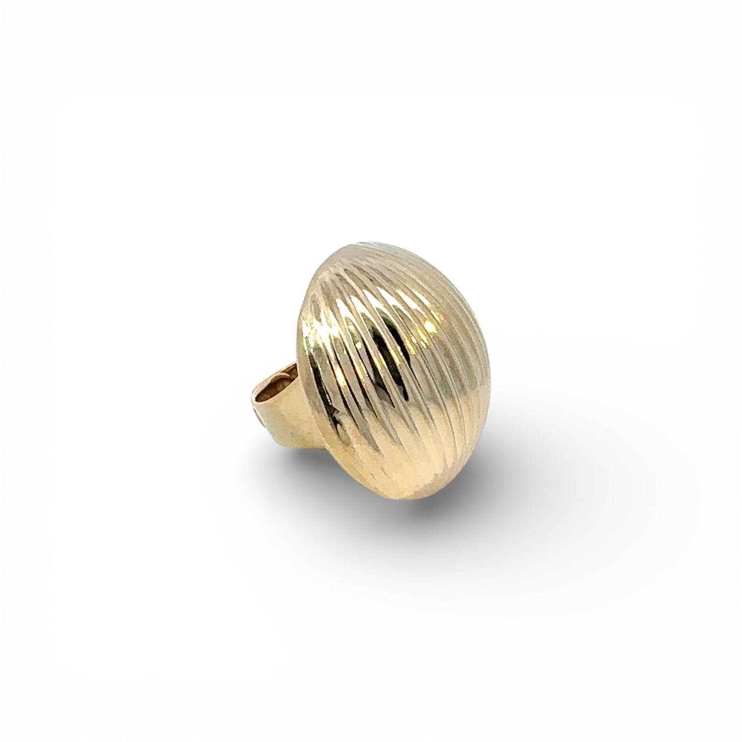 Esta sortija destaca por un diseño escultórico y contundente, protagonizado por una cúpula dorada de gran volumen con delicadas líneas estriadas que aportan textura y un brillo sofisticado. Su forma envolvente y pulida refleja la luz de manera elegante, convirtiéndola en una pieza con fuerte presencia visual. Es una sortija statement pensada para llevar sola, capaz de transformar cualquier look con carácter, fuerza y una estética atemporal de inspiración clásica reinterpretada en clave contemporánea.