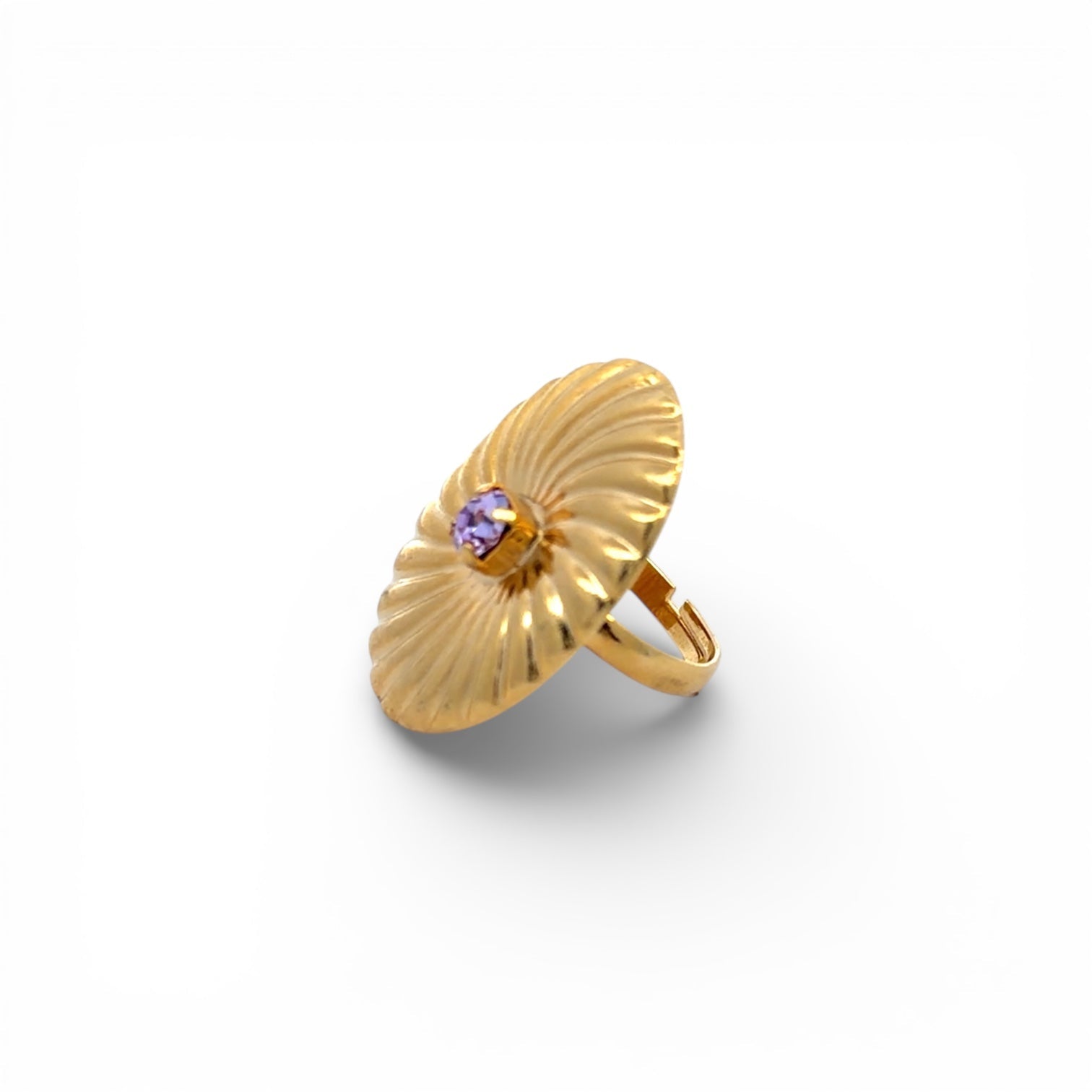 Esta sortija destaca por un diseño radial y luminoso, inspirado en la forma de un sol en movimiento. Sus líneas doradas estriadas se abren desde el centro, donde un delicado cristal en tono lila aporta un punto de color sutil y sofisticado. El contraste entre el volumen del metal pulido y el brillo suave de la piedra crea una pieza con carácter, elegante y muy favorecedora. Es una sortija statement que aporta luz, personalidad y un aire joyero especial a cualquier look, tanto de día como de noche.
