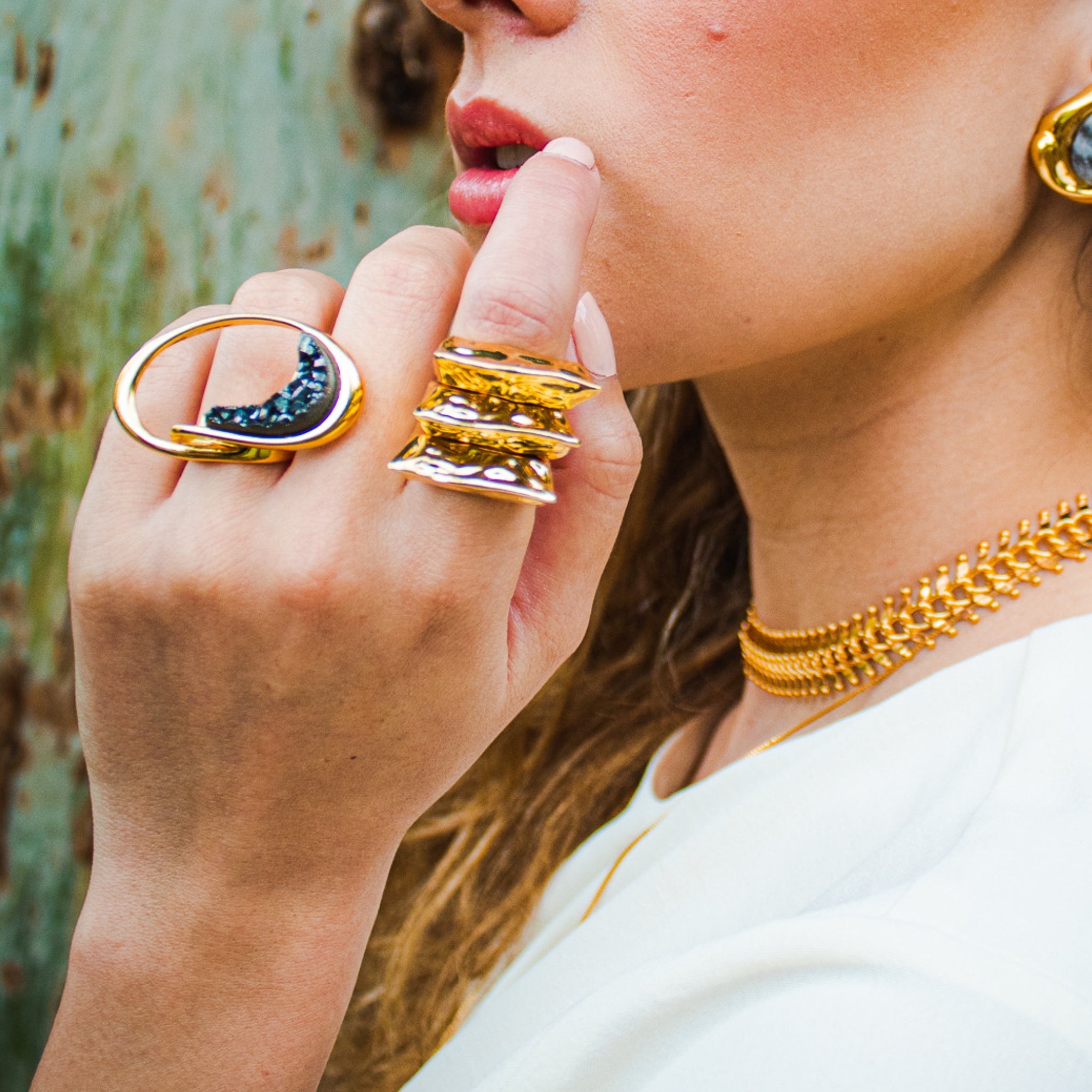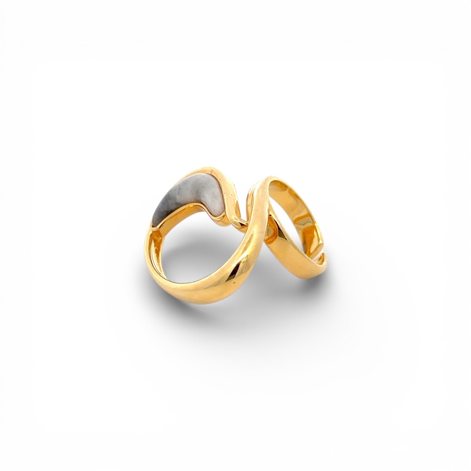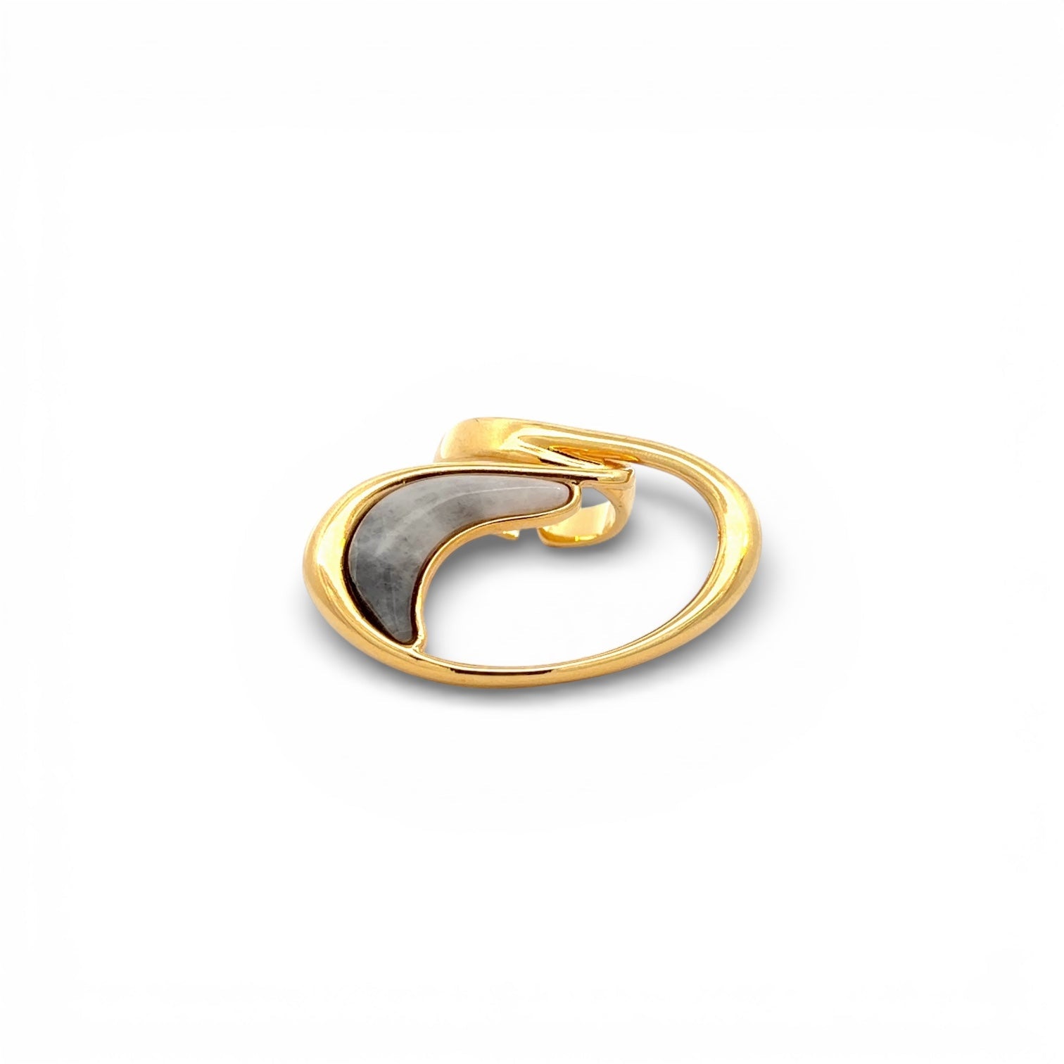 Esta sortija destaca por un diseño orgánico y fluido, inspirado en formas naturales y líneas envolventes. La estructura dorada de acabado pulido abraza una pieza central en tono gris nacarado, creando un contraste elegante y muy sofisticado. Su silueta abierta y asimétrica aporta movimiento y carácter, convirtiéndola en una sortija statement con una estética moderna y artística. Es una pieza con personalidad, ideal para quienes buscan una joya diferente, con presencia y un equilibrio perfecto entre fuerza y elegancia.
