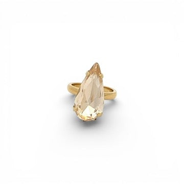 Este anillo destaca por su cristal en talla lágrima, que aporta elegancia y presencia con un brillo sutil y sofisticado. Su diseño estilizado y vertical alarga visualmente la mano, convirtiéndolo en una pieza protagonista ideal para elevar cualquier look. El tono suave del cristal, combinado con el acabado dorado, crea una estética refinada y atemporal, perfecta tanto para ocasiones especiales como para dar un toque distintivo a estilismos más sencillos.
