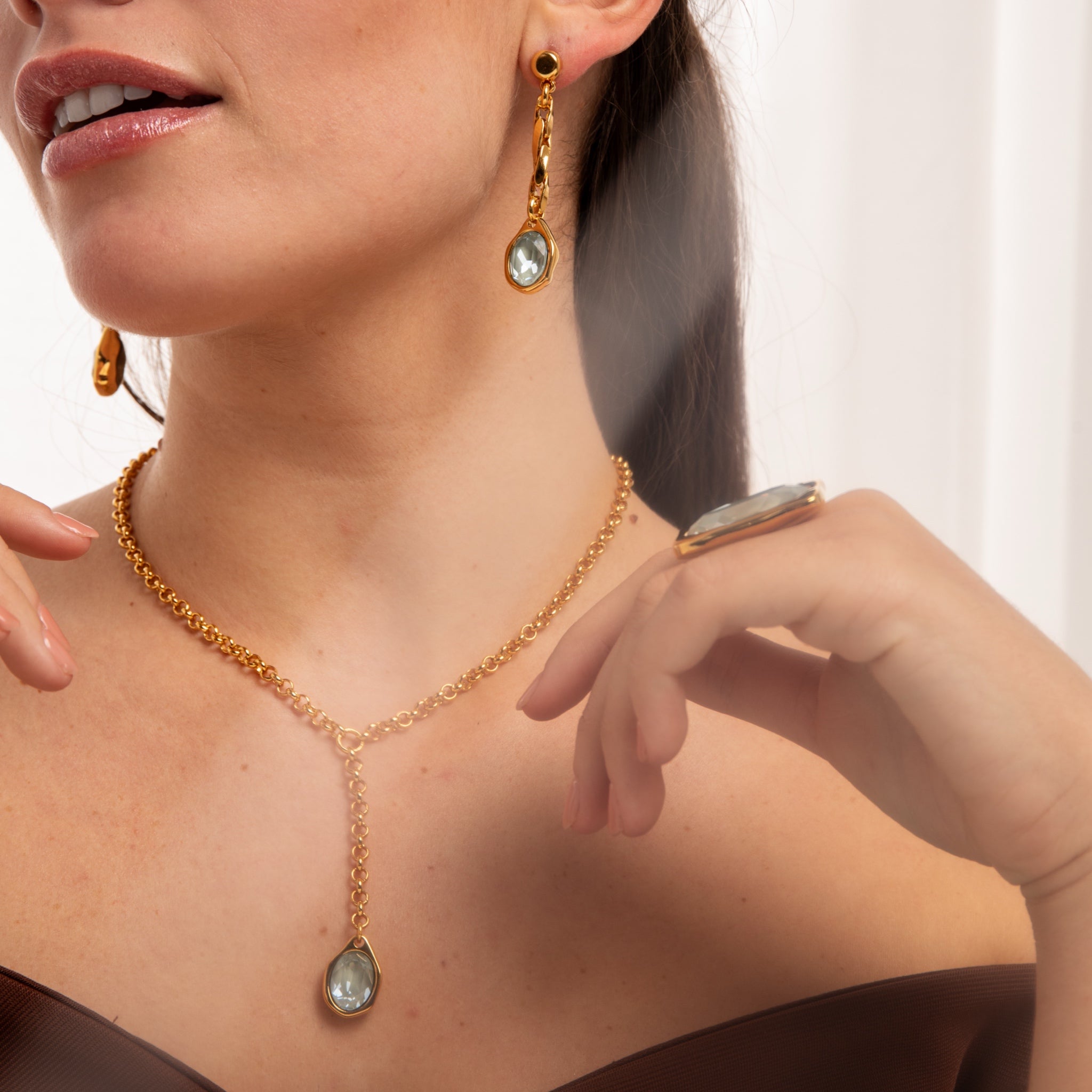 Este collar con cristal de Swarovski combina elegancia y modernidad en un diseño dorado de líneas delicadas. Su cadena fina con caída central resalta un brillante cristal en tono champagne, que refleja la luz con destellos únicos.