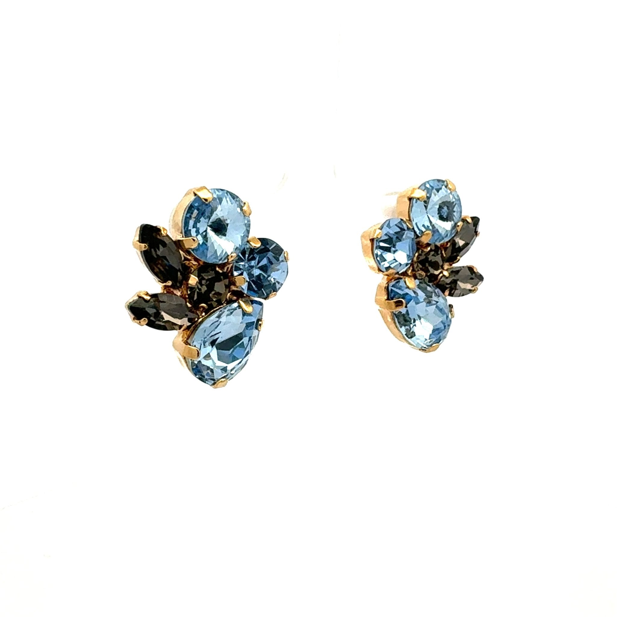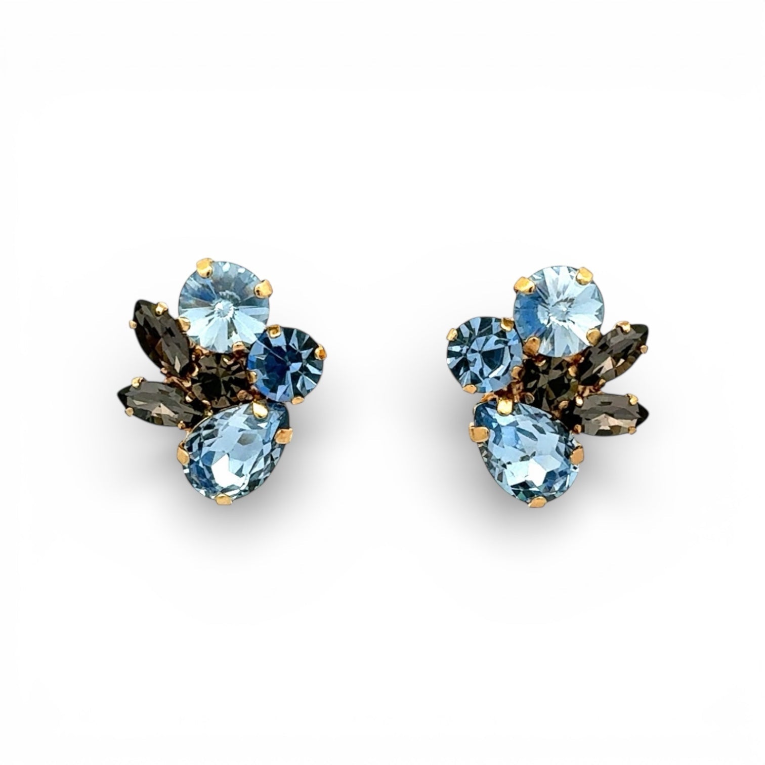 Estos pendientes presentan un diseño sofisticado y equilibrado, formado por una composición de cristales en tonos azules y ahumados que crean profundidad, contraste y brillo. La mezcla de piedras claras y oscuras aporta un efecto visual elegante y muy refinado, mientras que su formato compacto los convierte en una pieza versátil con carácter. Son ideales para aportar color de forma sutil pero distintiva, elevando tanto looks de día como estilismos más especiales.